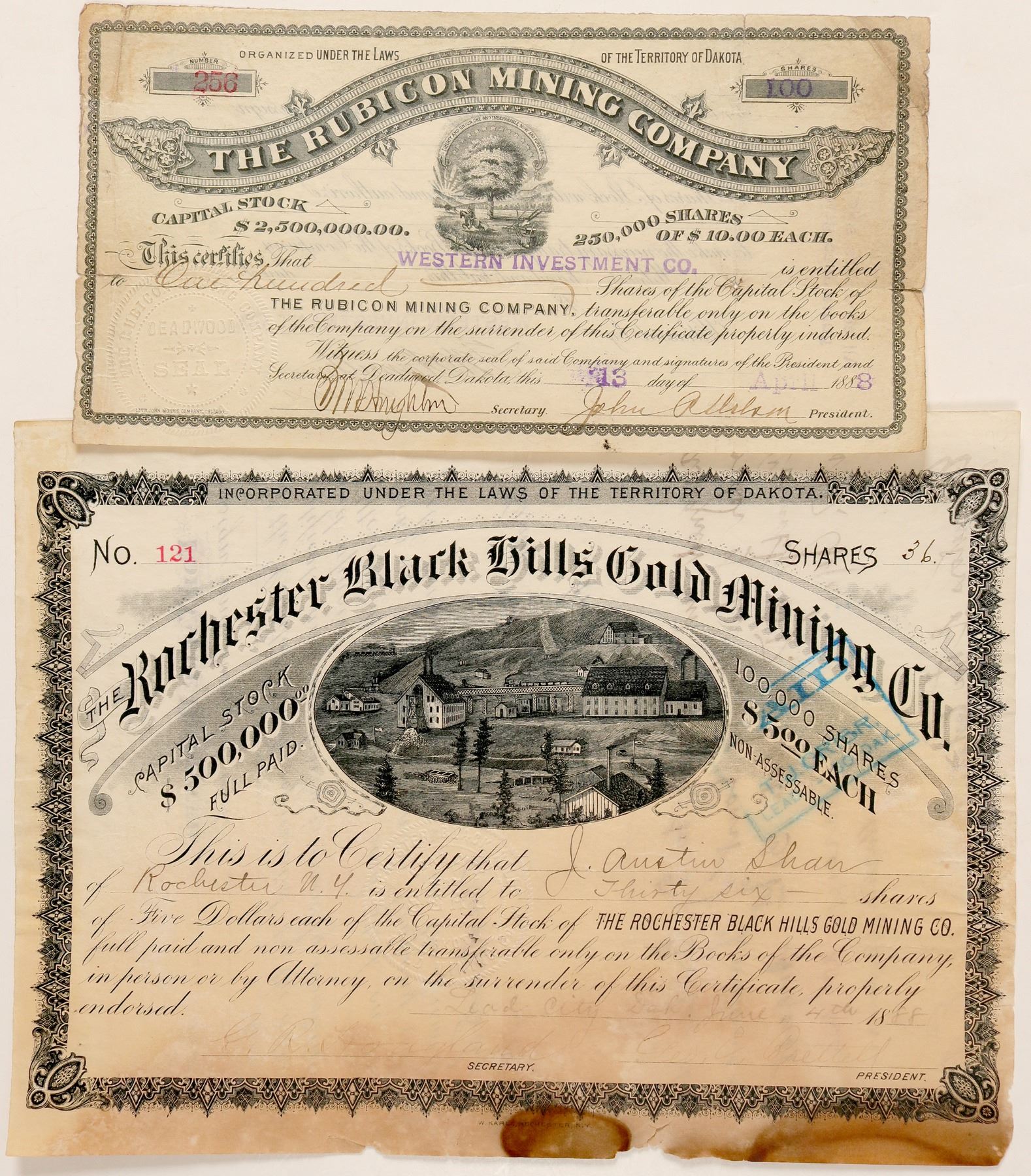 Lot of 2. 1) The Rubicon Mining Company. No. 256, issued for 100 shares to Western Investment Co. on April 13, 1888. Signed by the president and secretary. Not cancelled. Black border and print. Vignette of man on horse under a tree. 4.5 x 8.5 Heavy folds with separation, some soiling. Inc. in 1886. Deadwood. 2) Rochester Black Hills Gold Mining Company. No. 121, issued for 36 shares to J. Austin Shaun on June 4th, 1888 in Lead City. Signed by the president and secretary (names are unreadable). Stamped cancelled. Black border and print. Birds-eye view vignette of mines on a hill (Lead City?). Heavy staining and wear on the bottom third of the certificate. 7.5 x 10.25" Inc. 1887. Lead City. () Ken Prag Collection