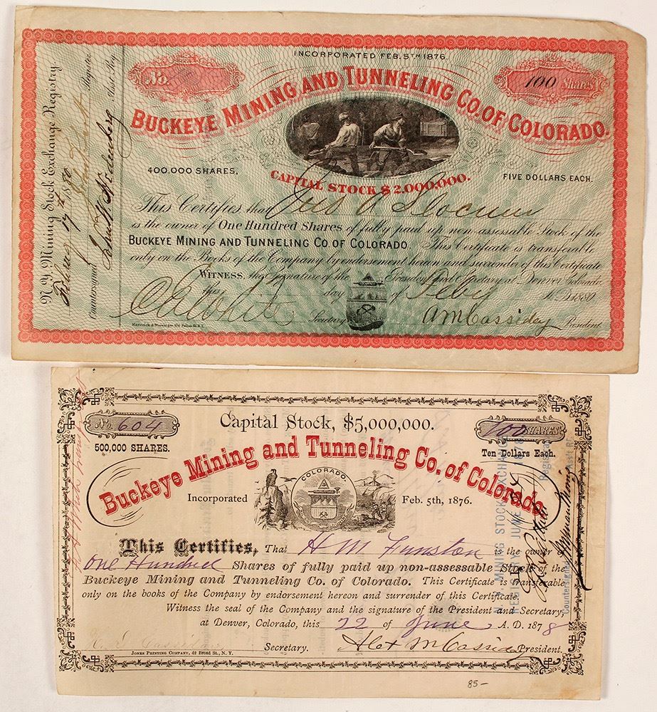 Two different. Inc. in Colorado, 1876. 1) No. 604, issued for 100 shares to HW Funston on June 22nd, 1878 in Denver. Signed by Alex. M Cassidy, president, and H.D. Cassidy, secretary. Small (5 x 8.5") certificate with the Colorado state seal surrounded by an eagle and miners. Pinholes, folds, some creasing. 2) 1880 issued stock No. 498 for 100 shares. Also signed by Cassidy as president and E.A. White, Secretary. Not cancelled. Green border with red and black print and a mining vignette. Pinholes, folds, one missing corner. Owned the Silver Cliff mine with assays $20-75/ton. Large masses of ceragyrite (75% silver chloride) of this ore were mined near the surface works which yielded 30-50 oz/ton. At the time of these certificates, Silver Cliff had a population of 5,000. Alex M. Cassidy lived in Colorado for some time before becoming president of this company. In 1862, he purchased oil claims at Oil Springs, Fremont County from Gabriel Bowen. Cassidy sunk six wells that were moderately profitable. The timing of these certificates matches the boom period for the Silver Cliff Mining District. [Ref: Dallas, p174-177; Balch p.1153; Eckel, p.94; Stone, 1918, p.287] (Al Adams Gold Rush Memorabilia Collection) Date: Location: Silver Cliff, Colorado HWAC# 59031