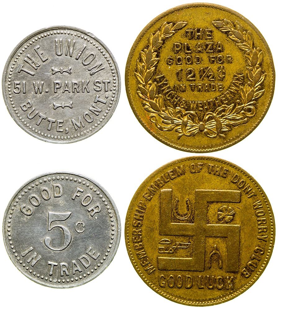 1) The Union // GF / 5c / IT. Round, aluminum. 2) Membership Emblem of the Don't Worry Club / Good Luck // The Plaza / GF / 12-1/2c / IT. (Svoboda Collection) City: Butte State: Montana Date: HWAC# 35375