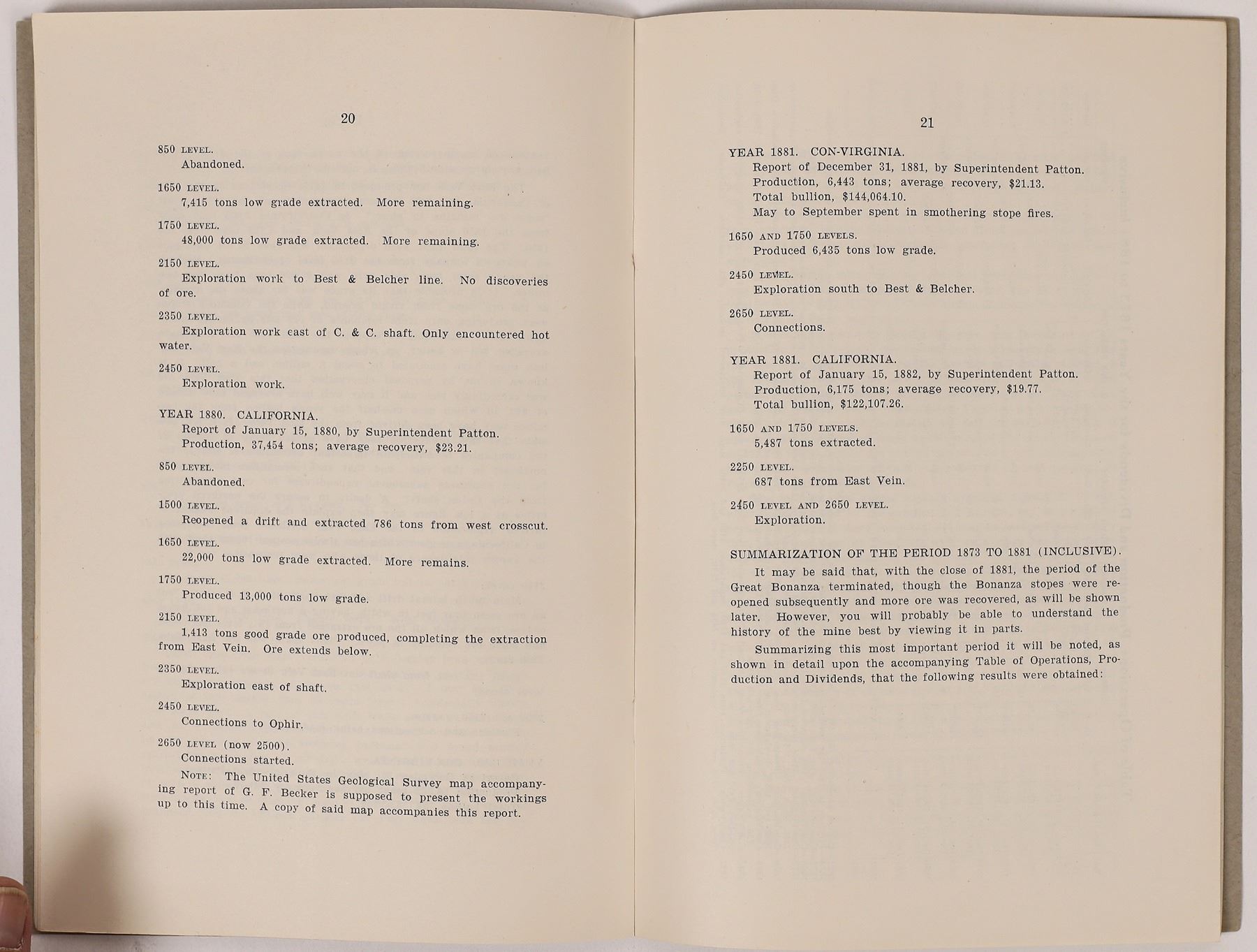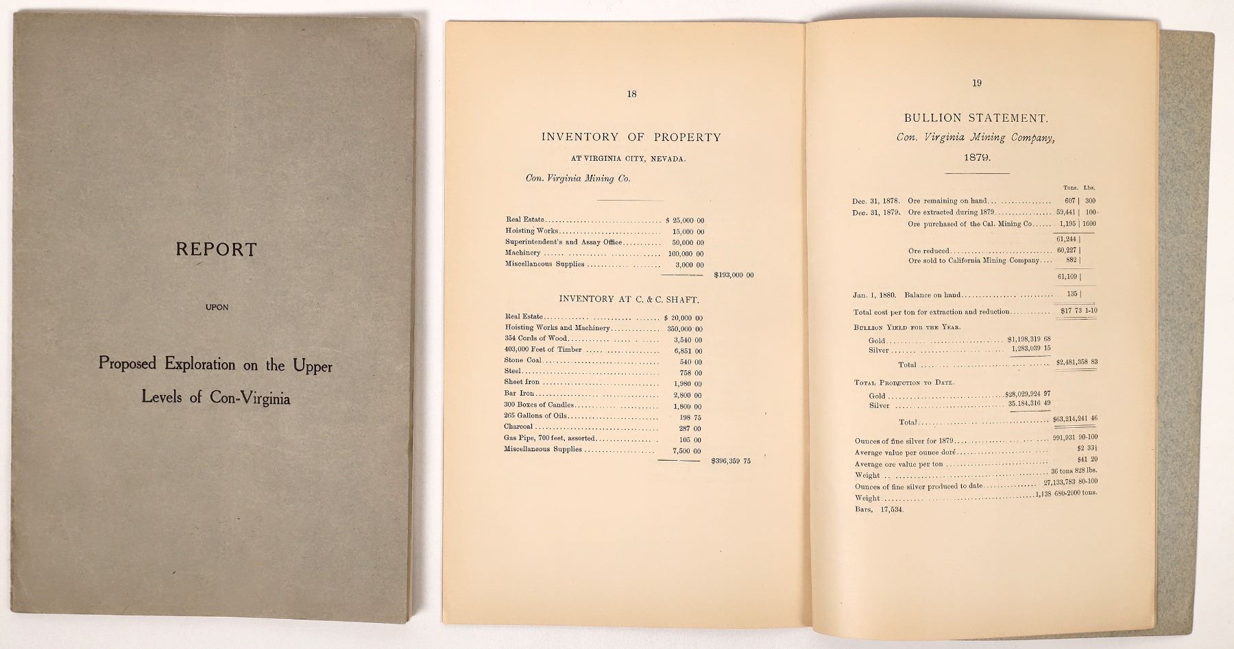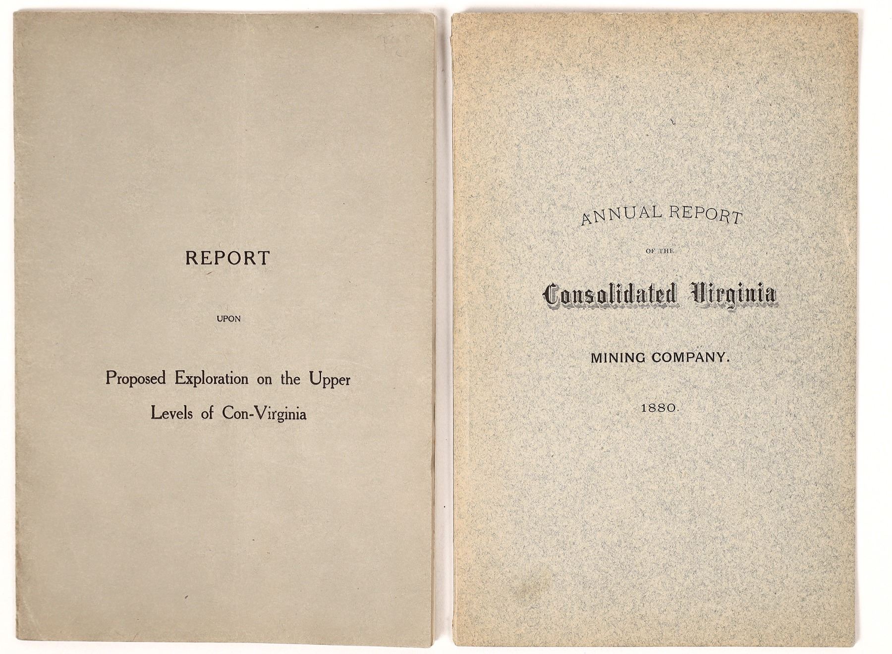 Lot of 2 different for this famous mine owned by the Bonanza Kings and the site of the Big Bonanza discovery. 1) Report Upon Proposed Exploration on the Upper Levels of Con-Virginia. 1913. Extremely rare and important. 38pp. with fabulous color map detailing shafts, drifts and stopes of paying ore. Includes a history of the mining development at each level for both Bonanza Mines (the Con-Virginia and the Consolidated California) from 1873 ñ 1881. Table of Operations, Production and Dividends for the same period. 9 x 6" Map is 11 x 14" 2) Annual Report of the Consolidated Virginia Mining Company, 1880. 24pp. No Bonanza Kings are listed as officers for the company. Reporting on bullion shipments, expenses, balance sheet, cash flow, etc. along with Presidentís report. Paper cover. 9 x 5.5" Virginia City Nevada Franklin Collection