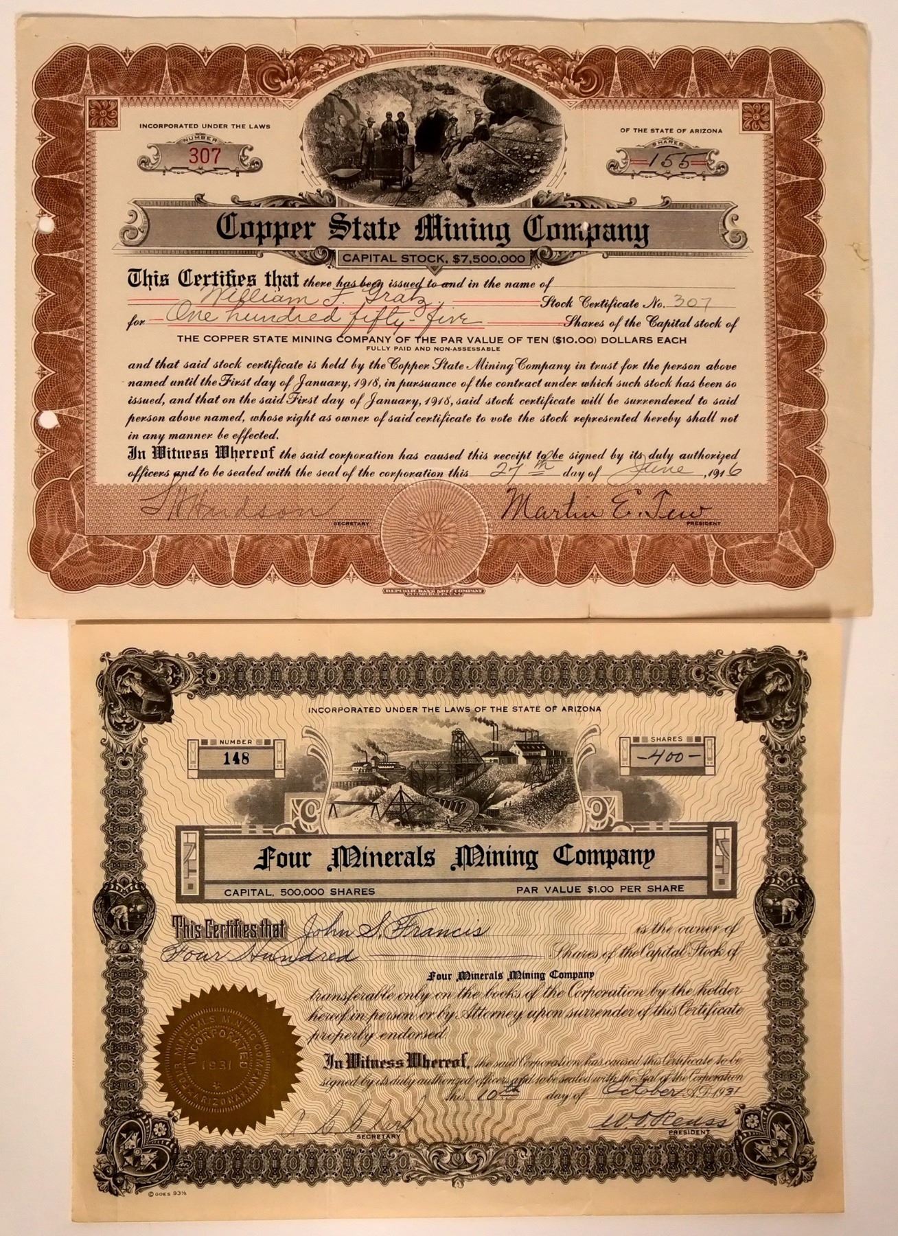 Lot of 2 different from this Pinal County ghost town. 1) Copper State Mining Company. Inc. in AZ. Bunker Hill District. No. 307, issued for 155 shares in 1916. Signed by president Martin Tew and the secretary. Punch cancelled. Brown border, black print, and nice mining vignette. Folds, pinholes, small tears, and toning. 2) Four Minerals Mining Company. Inc. in AZ. No. 148, issued for 400 shares to John Francis in 1931. Signed by president Reuss and secretary Clark. Not cancelled. Black border and print, gold seal, and multiple mining vignettes. Deep folds, toning.