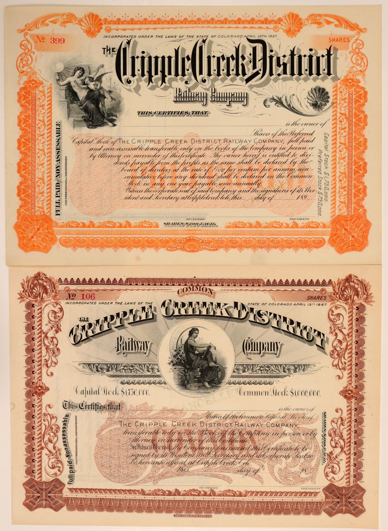 Lot of two unissued. Inc. in 1897. Both printed by New York Bank Note Co. One features a vignette of a nude allegorical woman. Stubs attached. Some toning. Organized by Lucian D. Ross, Thomas Burk, James L. Lindsay, W.T. Doubt and Kurnel R. Babbitt, to operate a 6.25 mile road from Cripple Creek to Victor. City: Cripple Creek State: Colorado Date: 1890s