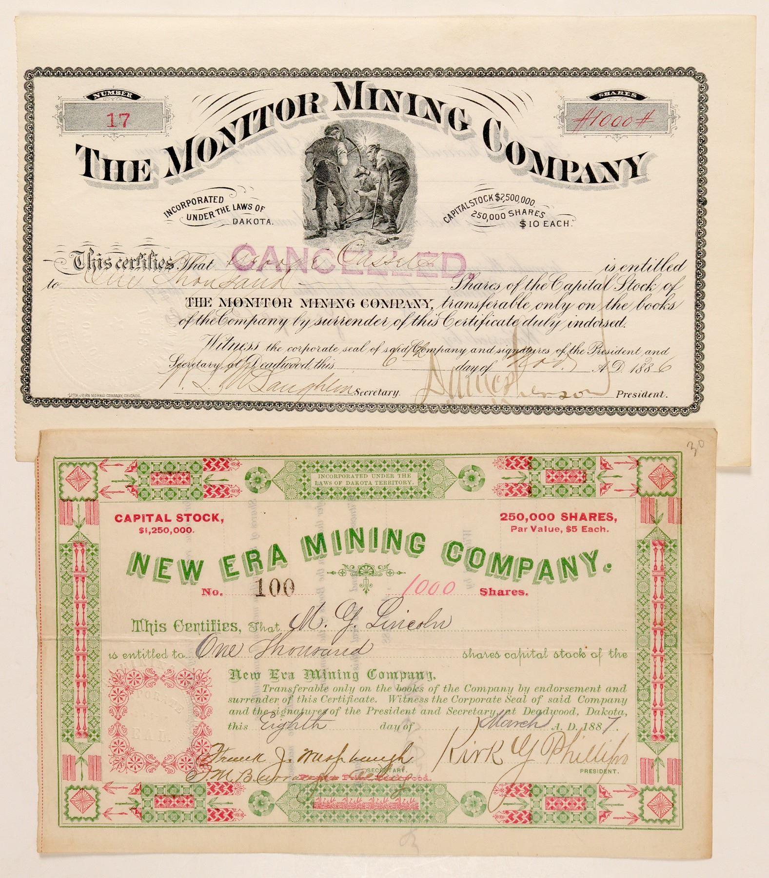 Lot of 2. 1) The Monitor Mining Company. Inc. in Dakota. No. 17, issued for 1,000 shares to George Cussels on Nov. 6th, 1886 ion Deadwood. Signed by president McPherson and secretary Laughton. Stamp cancelled in purple ink. Small certificate (5.5 x 9") with black border and print, mining vignette. Very clean. Seth Bullock was on the board of directors. According to E&MJ Vol. 48, the company was paying a dividend and bought interest in the Gentle Annie Lode. 2) New Era Mining Company. No. 100, issued for 1,000 shares to MJ Lincoln on March 8th, 1887. Signed by Kirk Phillips as president and two secretaries. Not cancelled. Cute design with red and green print and a very ornate border. 5.25 x 8.25" Pinholes, folds. () Ken Prag Collection