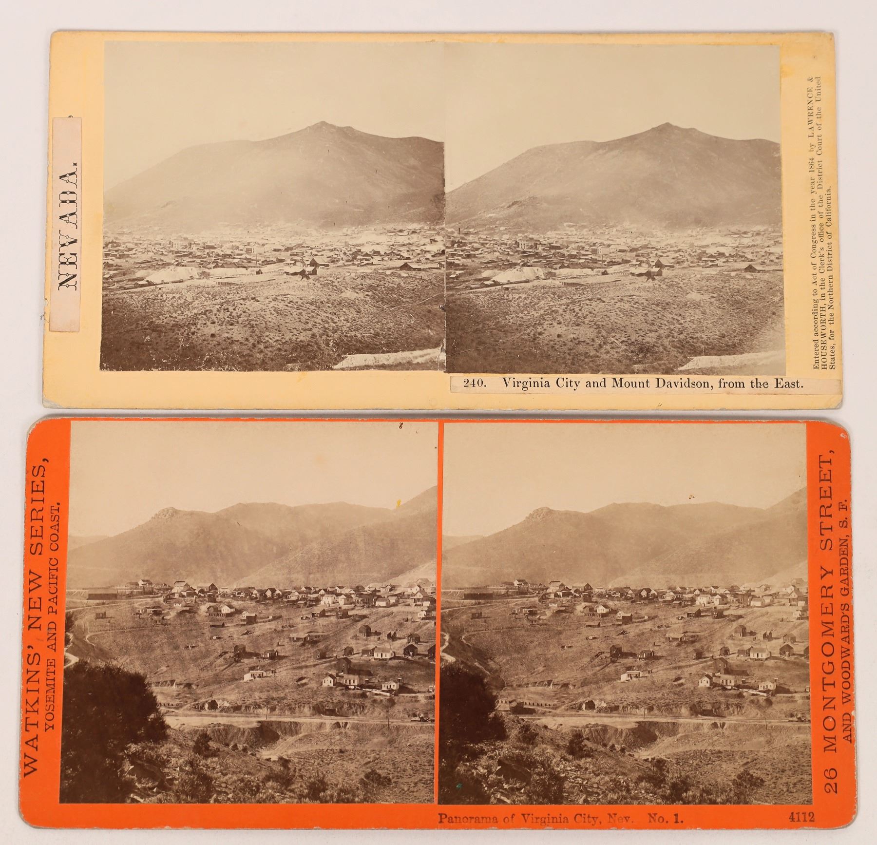 Lot of 2 different. 1) Lawrence & Houseworth, 1864, 240. "Virginia City and Mount Davidson, from the East." Reverse is stamped with their information for their studio at 637 Clay Street, San Francisco. Medium contrast, poor focus. 2) Watkins' New Series Yosemite and Pacific Coast, 26 Montgomery Street, SF. c.1876-79. "Panorama of Virginia City, Nev. No. 1." 4112. California Pan Mill in the foreground. Sharp focus, medium contrast. Carleton E. Watkins photographed the Comstock twice in the mid 1870's at the height of the Big Bonanza strike.