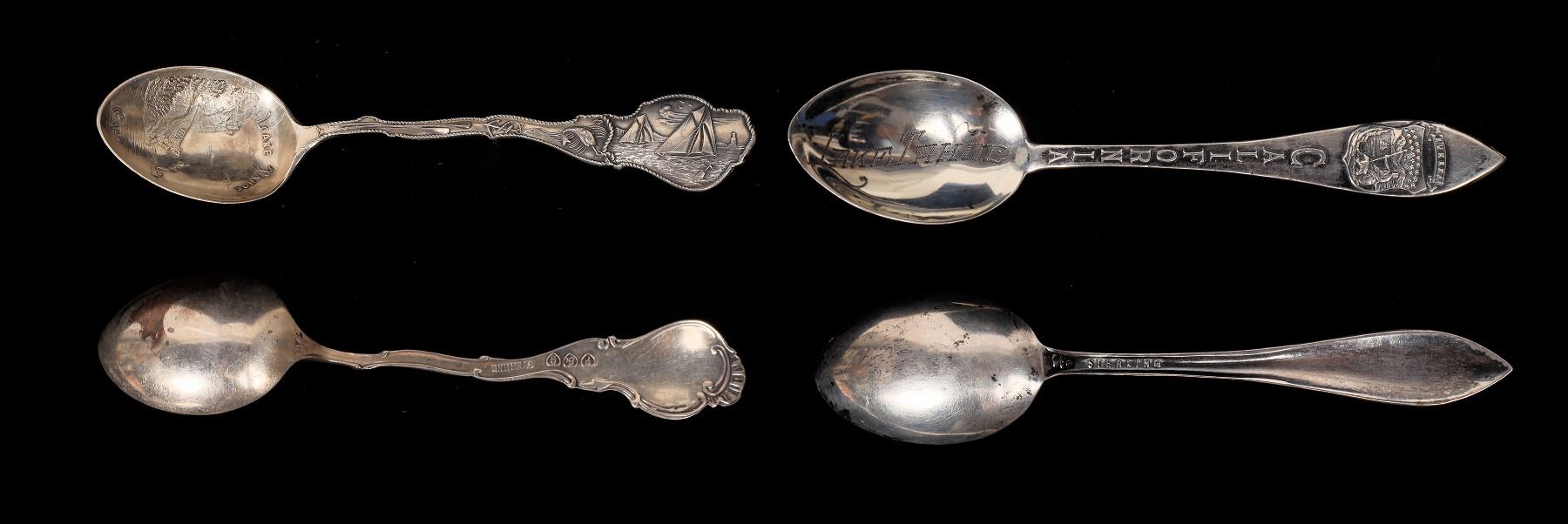 Lot of 2 different. 1) Great little spoon with vignette of steamer near Cave Rock! c.1910s. "Lake Tahoe Cal." Marked Sterling on reverse. Shows road around the side (no tunnel built yet). Marked Sterling. 4" 2) Smaller spoon with "Lake Tahoe" engraved on bowl and "California" on handle. Reverse marked sterling. 4" Great pair of early souvenir spoons dating from the rise of Lake Tahoe as a tourist attraction in the early part of the 20th century.