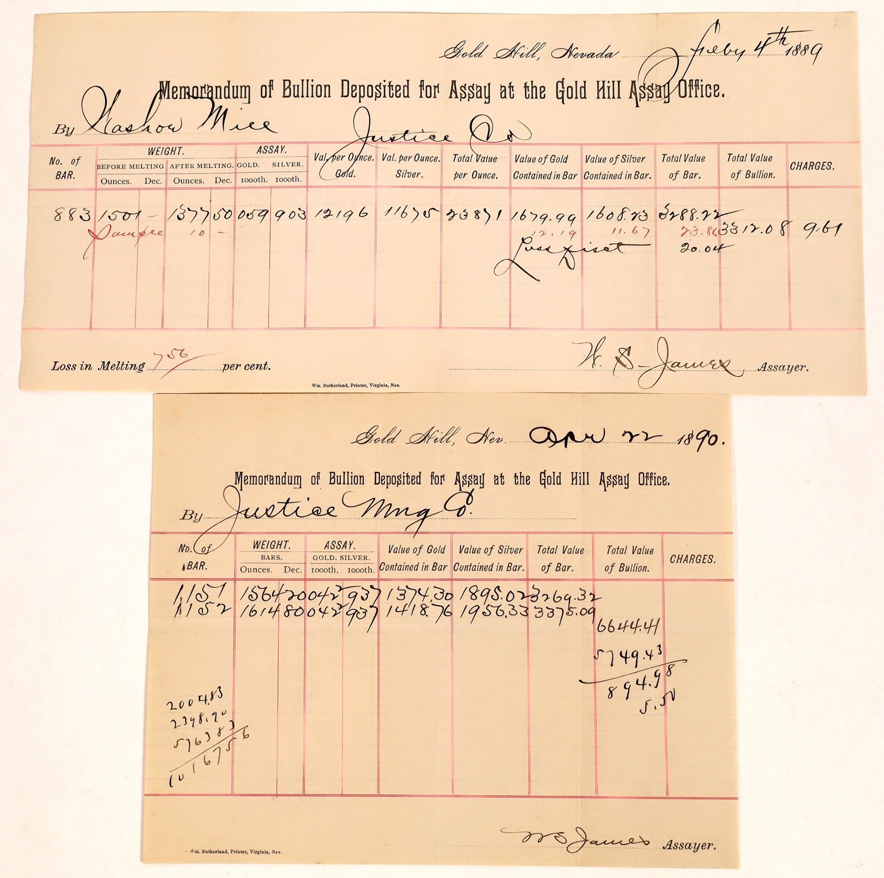 Lot of 2 different for the Gold Hill Assay Office, operated by assayer WS James. 1) 1889 large format receipt for deposit by the Washoe Mill. One bar, 1,377 ounces, $3,312.08. Signed by assayer WS James. 2) Smaller memorandum, 1890, for deposit by the Justice Mining Co. Two bars, total value $6,644.44. Signed by WS James.