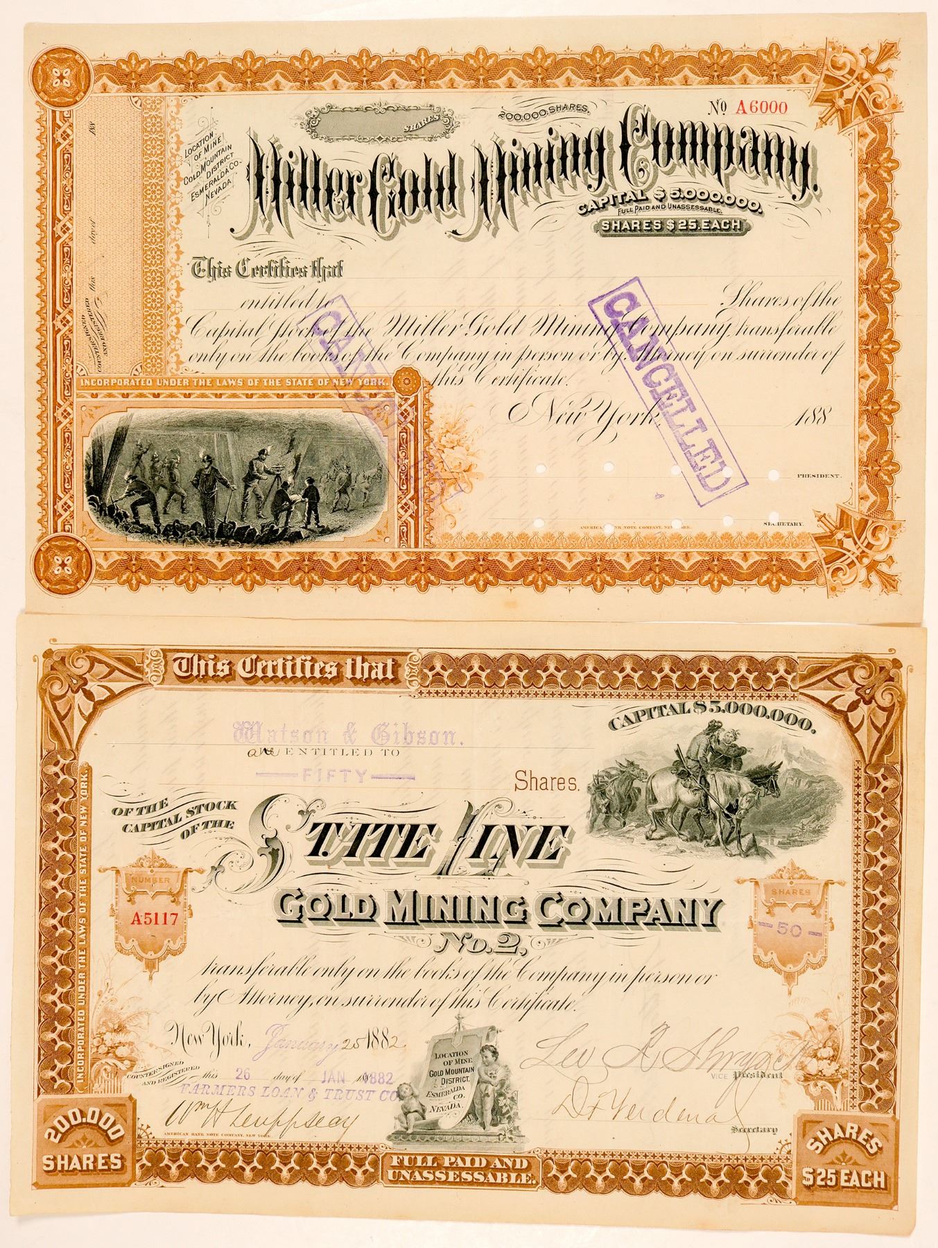 Lot of 2 Gold Mountain, Esmeralda County stocks; one issued and one unissued. 1) State Line Gold Mining Company No. 2. Stock issued to Watson & Gibson for 50 shares on January 25, 1882. Signed by president Shyrock and secretary Verdenal. Not cancelled. Location printed on cert. Brown border and two vignettes: explorers on horseback and children next to banner (which displays the location). Pinholes, folds. 2) Miller Gold Mining Company. Unissued but stamp and punch cancelled. Location printed to the left of title. Brown border with vignette of miners with headlamps. Pinholes. () Ken Prag Collection