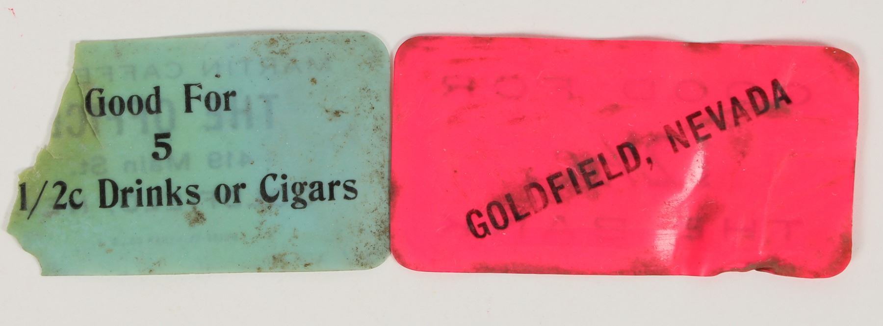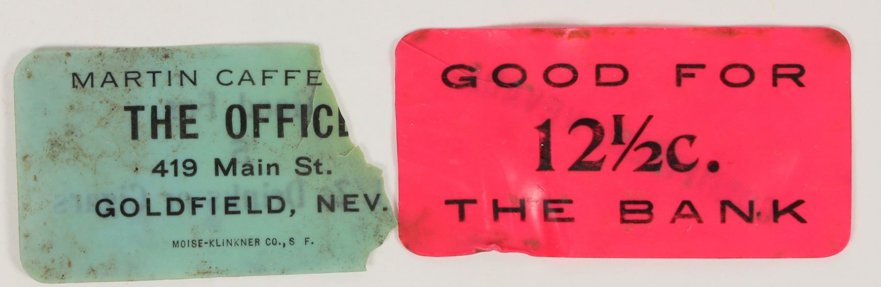Lot of 2 different. 1) Martin Cafferata / The Office/ 419 / Main St. / Goldfield, Nev. // GF / 5/ 1/2c Drinks of Cigars. Moise-Klinkner Co. SF. Right side clipped. 1 x 1.5" 2) GF / 12.5c / The Bank // Goldfield, Nevada. 1 x 1.75"