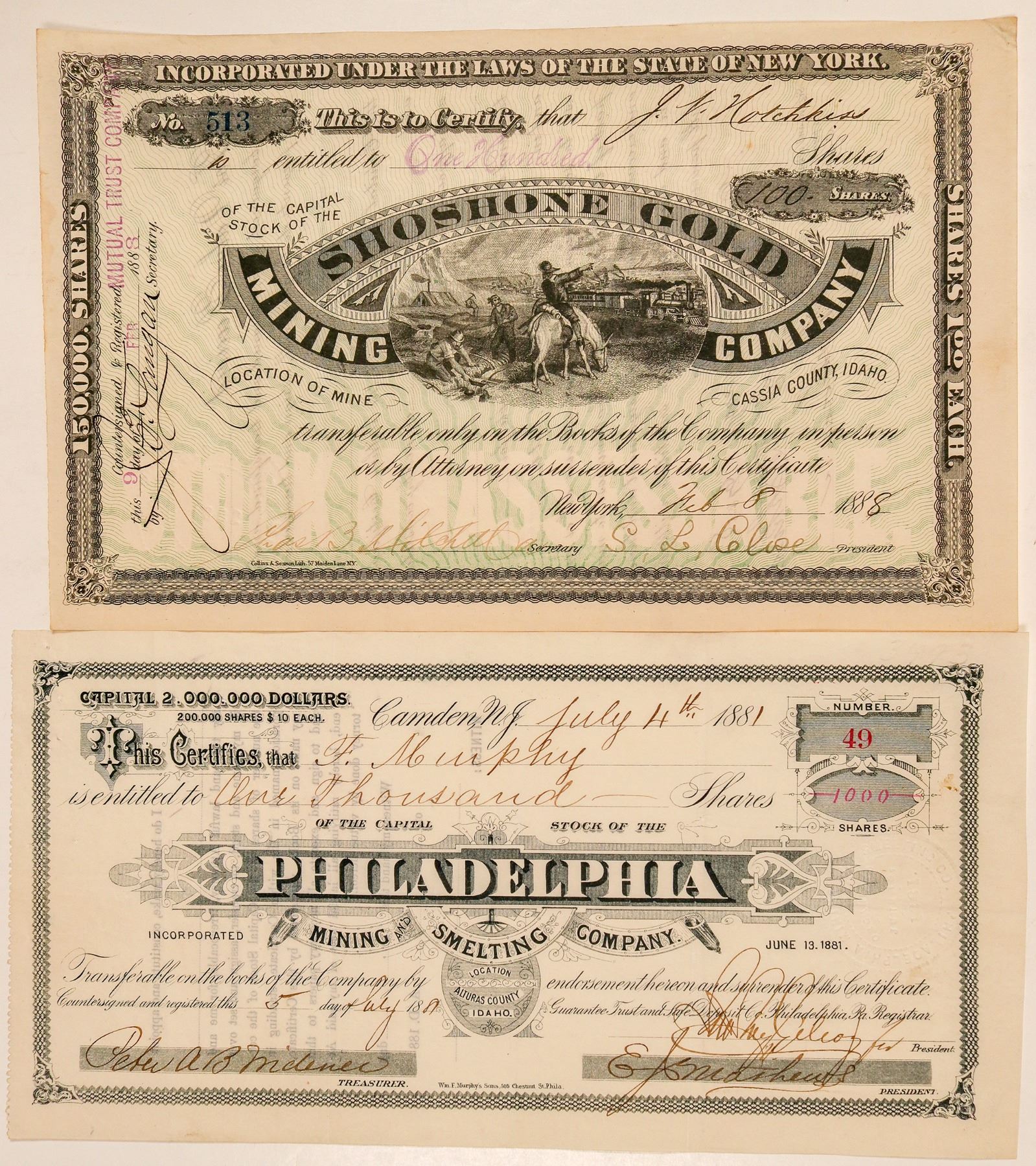 Lot of 2 different. 1) Philadelphia Mining and Smelting Company. Location: Alturas County, Idaho (printed under title). No. 49, issued for 1,000 shares to F. Murphy on July 4th, 1881. Not cancelled. Black border and print, fancy logo. Pinholes, folds. 5 x 9.5" 2) Shoshone Gold Mining Company. Location of Mine: Cassia County, Idaho (printed under vignette). No. 513, issued for 100 shares to Hotchkiss on Feb. 8, 1888. Signed by president Close and Hotchkiss. Not cancelled. Black border and print, green background. Great western vignette showing gold panners and a locomotive. 5.5 x 9" Tiny pinholes and folds. State: Idaho City: Date: 1881 & 1888