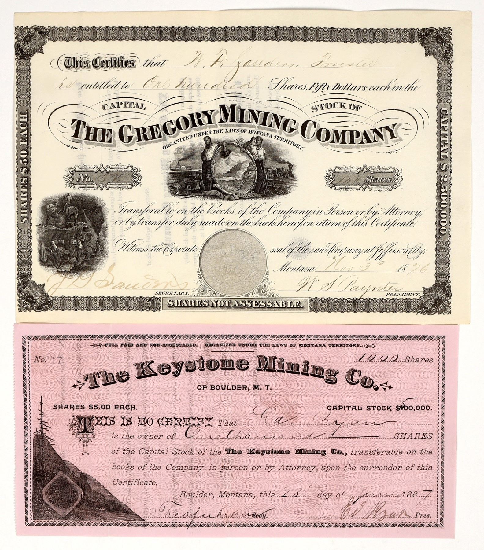 Lot of two different. 1) The Gregory Mining Company. Organized in Montana Territory. Issued to future US Senator WF Sanders for 100 shares in 1876 at Jefferson City, Montana. Not cancelled. Mining and allegorical vignettes. Folds, clean. The Gregory mine is located three miles north of Wickes, Jefferson County. 2) The Keystone Mining Company of Boulder, M.T. No. 17, issued for 1,000 shares to Ryan in 1887 in Boulder, Montana. Signed by president Ryan and the secretary. Not cancelled. Black print on pink paper with mountain mining vignette at left. Folds.