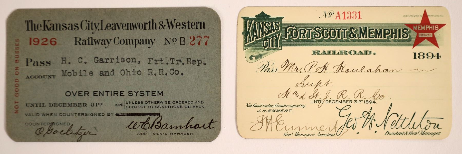 Lot of 2 different. 1) Kansas City, Fort Scott & Memphis Railroad. Pass issued in 1894 to PH Houlahan. Countersigned by JH Emmert. Preprinted signature of Geo. Nettleton. Green print with red star logo on cardstock. 2) Kansas City, Leavenworth & Western Railway Company. Pass issued in 1926 to HC Garrison, Mobile & Ohio RR. Signed by the general manager. Black and red print on gray cardstock.