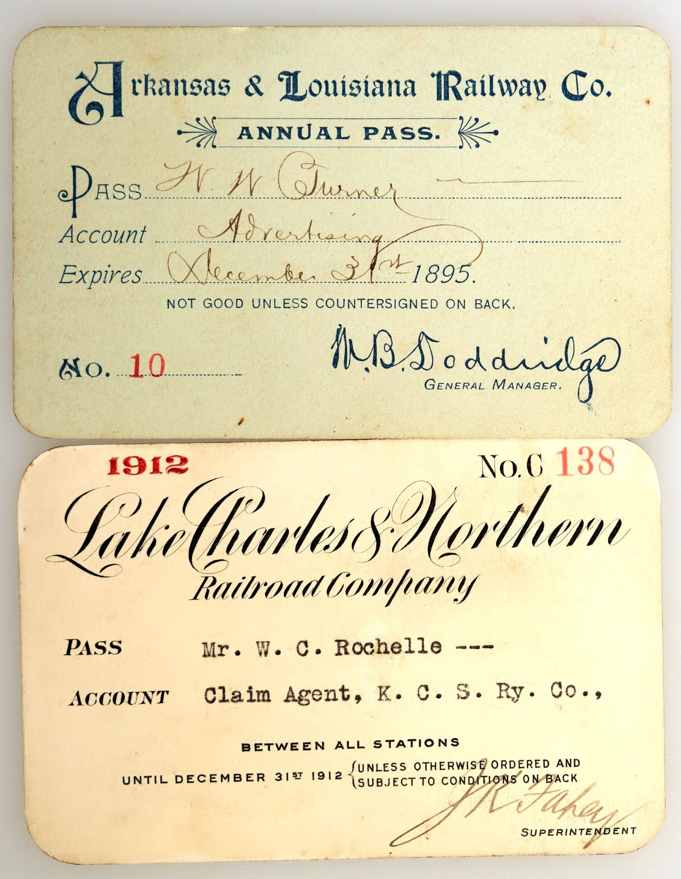 Lot of 2 different. 1) Arkansas & Louisiana Railway Company. Pass issued for 1895 to WW Turner. Preprinted signature of general manager Doddridge. Countersigned by FF Fitzpatrick. Blue print on cardstock. 2) Lake Charles & Northern Railroad Company. Pass no C138 issued for 1912 to WC Rochelle. Signed by the superintendent. Endorsed by Rochelle. Located in the southwestern part of Louisiana, the line forming a part of Atlantic System of the Southern Pacific Company. The owned mileage extends in a northerly direction from Lake Charles to De Ridder, La., a distance of 44.357 miles.