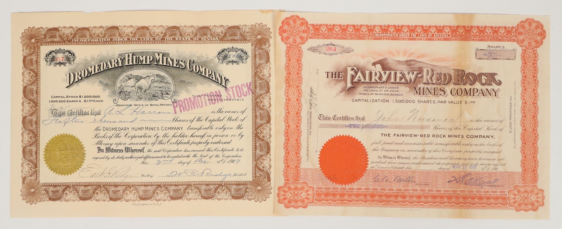Two Rare Stocks From Fairview, Nevada: 1) Dromedary Hump Mines Co., 1909. Operated the Deconsado Mine at Fairview, Churchill Co.. 2) Fairview-Red Rock Mines Co., 1907, also operated at Fairview. FH notes that the air force dropped a bomb down the Dromedary shaft and there was a resulting lawsuit. Fairview, Nevada, is a former mining town now located within the Bravo 17 bombing range of the Nevada Test and Training Range (NTTR).