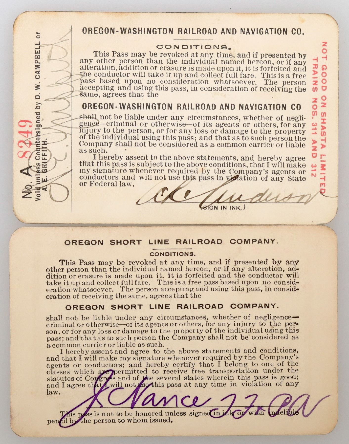 Lot of 2 different. 1) Oregon-Washington Railroad & Navigation Company. Lines between Portland, Oregon, Gray's Harbor, & Seattle, Washington. Issued for 1911 to AR Anderson of AT&SF. Preprinted signature of vice president/general manager. Printed on cardstock. 2) Oregon Short Line Railroad Company. Pass issued for 1913 to J. Nance of UPRR. Preprinted signature of the president, countersigned by Smith. Printed on cardstock. The Oregon Short Line Railway was organized in 1881 and operated in Idaho, Montana, Oregon, Utah & Wyoming. Union Pacific wanted it be the shortest line between Wyoming and Oregon. Oregon 1911-13