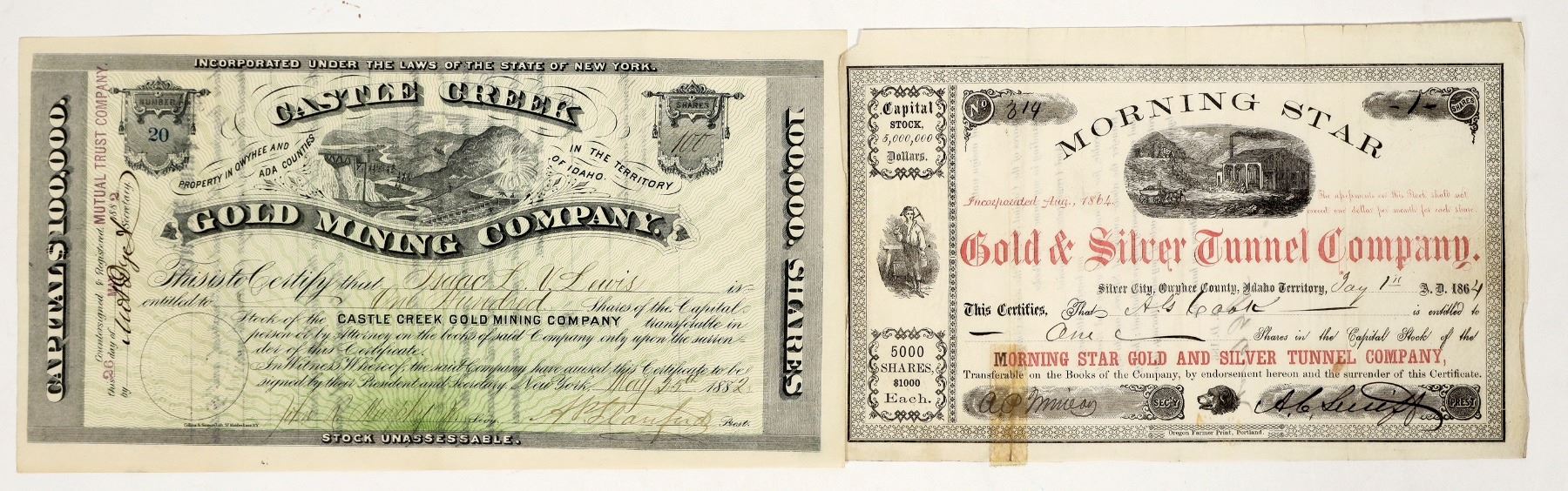 Lot of 2 different. 1) Morning Star Gold & Silver Tunnel Company. Inc. 1864. No. 314, issued for 1 share to AG Cook in Silver City, Idaho Territory in 1864. Signed by the president and secretary. Not cancelled. Black border, black and red print, nice mining vignette. Old tape repair with stain. 2) Castle Creek Gold Mining Company. Property in Owyhee and Ada Counties (stated on certificate). No. 20, issued in 1882 to Isaac Lewis in NY. Signed by the president and secretary. Not cancelled. Green underprint design. Nice hydraulic mining vignette. Folds.