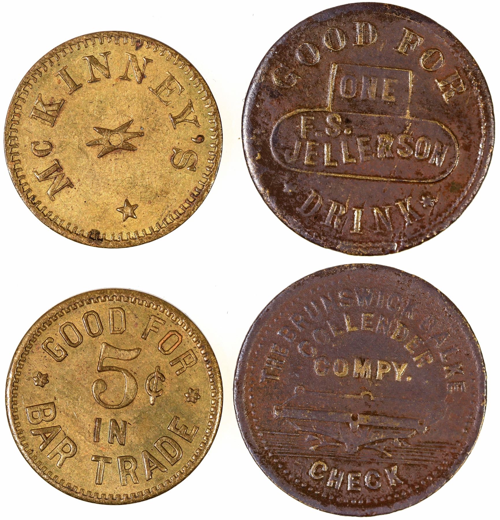 Lot of 2. 1) Good For / One / F.S. / Jellerson / Drink // The Brunswick Balke / Collender / Compy. / (pool table) / Check. Brass, round, 25mm. This is an 1880s token for a business at Glenbrook, Nevada, on the east shore of the lake. 2) McKinney's // GF / 5c / In / Bar Trade. Brass, round, 21mm. c.1890s. McKinney's was a resort located near Tahoma on the western shore of Lake Tahoe.