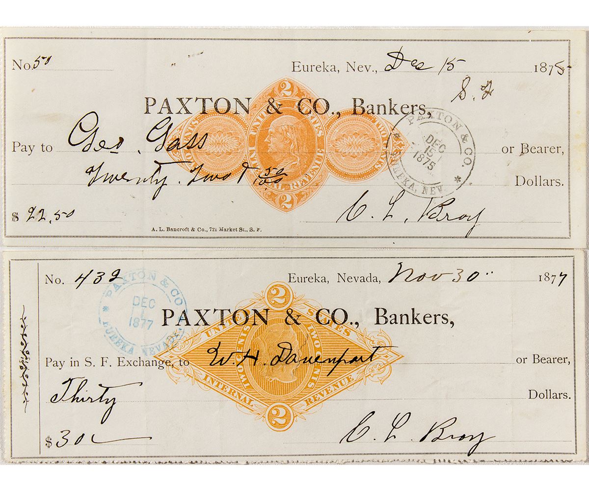 Both are from the same bank in Eureka: Paxton & Co. An 1875 with RN-D1 and an 1877 with RN-G1. Both are cut cancelled and folded.