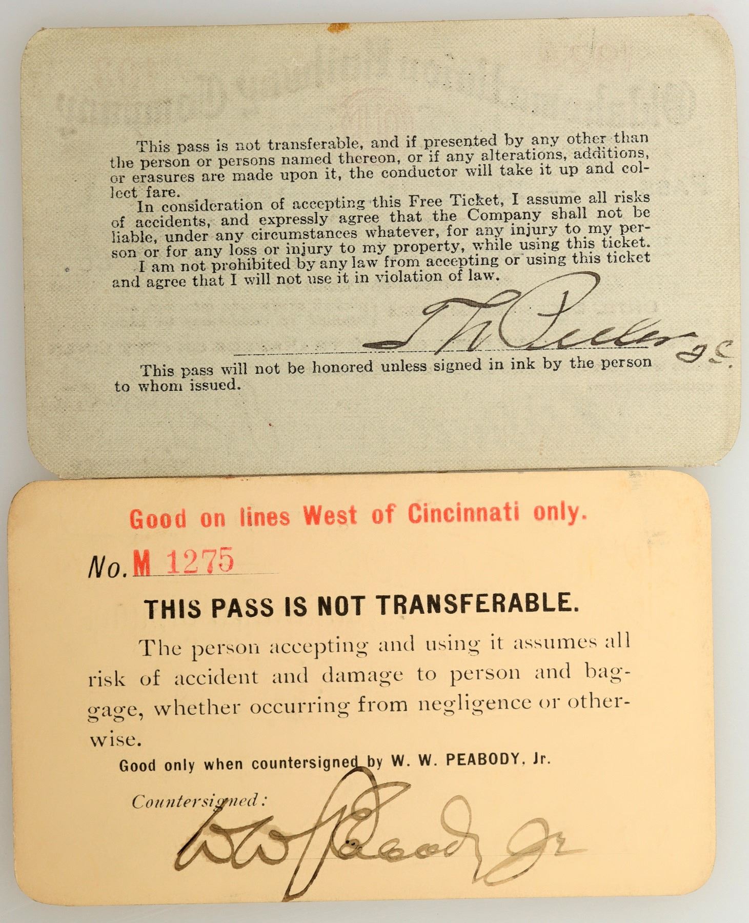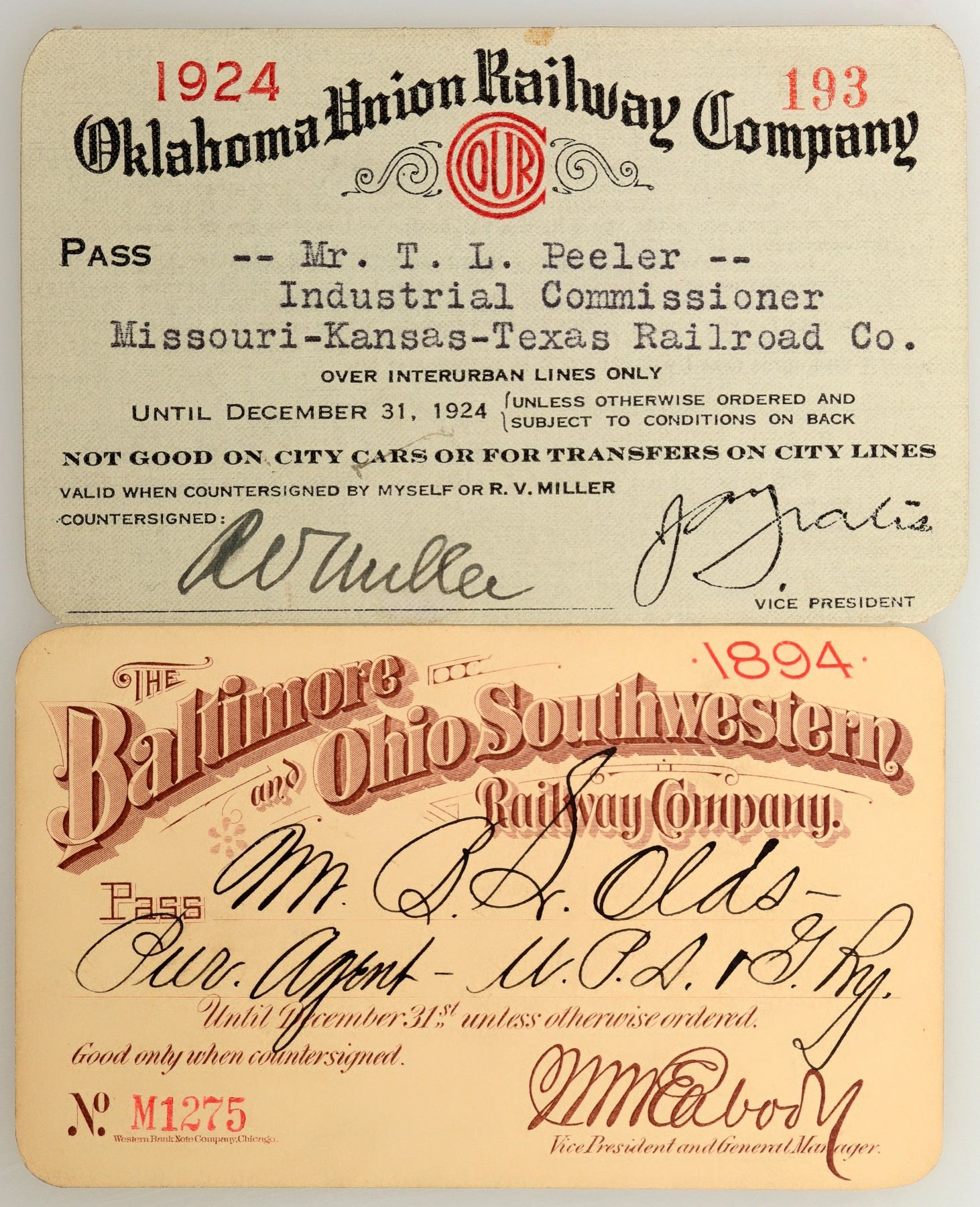Lot of 2 different. 1) Baltimore & Ohio Southwestern Railway Company. Pass no. M1275 issued for 1894 to BS Olds of the UPS&G Railway. Preprinted signature of the vice president. Brown print on cardstock. "Good on lines West of Cincinnati only" printed on the reverse. 2) Oklahoma Union Railway Company. Pass no. 193, issued for 1924 to TL Peeler of the Missouri-Kansas-Texas Railroad. Countersigned by RV Miller. The Oklahoma Union Railway Company operates hourly interurban service between Sapulpa and Tulsa.