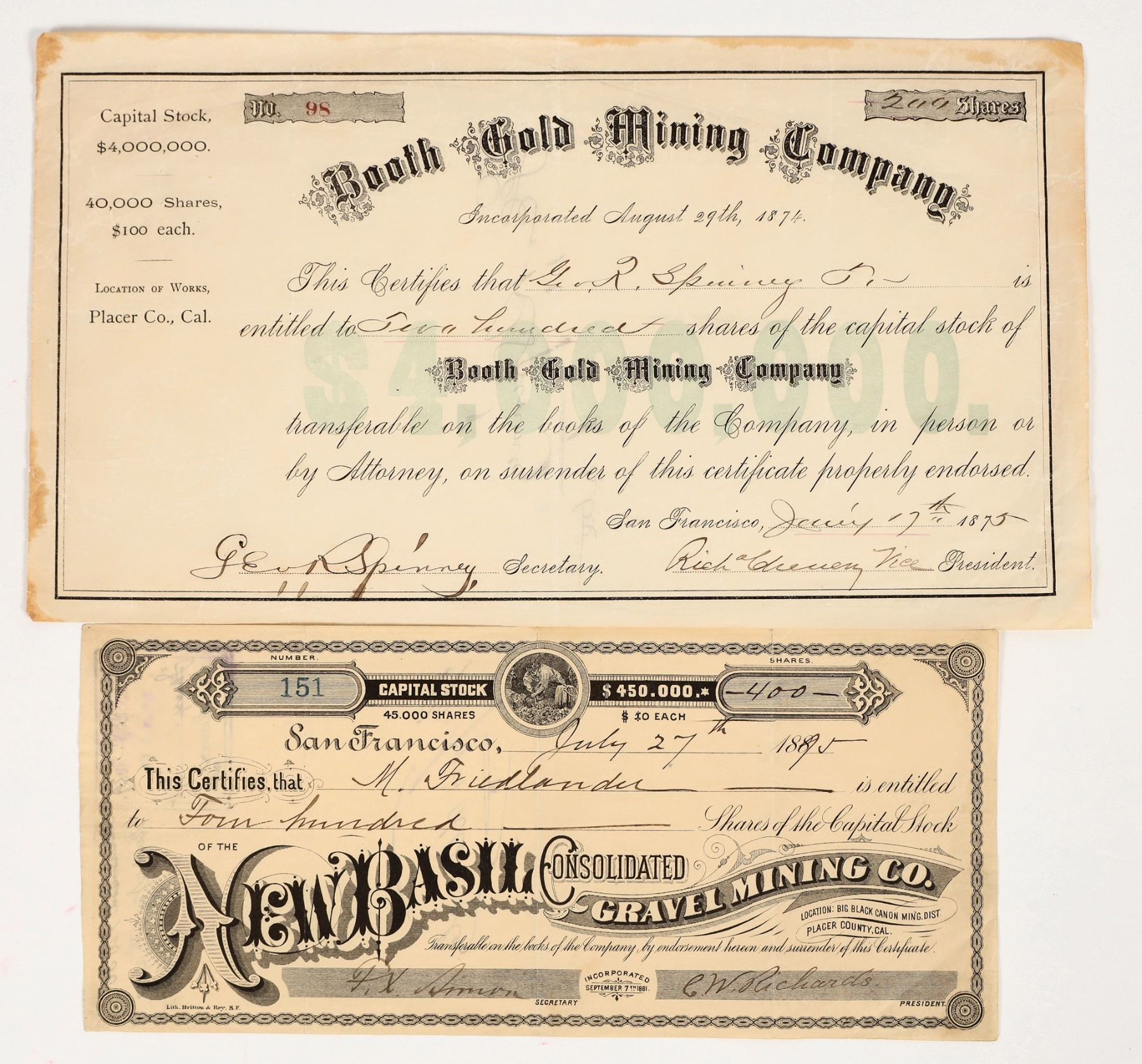 Lot of 2 different. Both self-identified as Placer County. Both are very rare. 1) New Basil Consolidated Gravel Mining Company. "Big Black Canon Mining District, Placer County, Cal" printed under title. Issued in 1895 for 400 shares. Signed by president CW Richards and secretary Simon. Not cancelled. Fancy design by Britton & Rey. Folds, creases. This company operated two miles east of Westville, Placer County. 2) Booth Gold Mining Company. Issued in 1875 for 200 shares. Signed by the vice president and secretary. Not cancelled. Folds, some staining around the edges. Operated the Orleans mine near Auburn, Placer County.