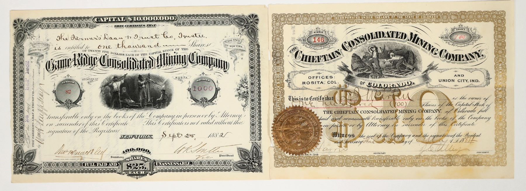 Lot of 2 different. 1) Game Ridge Consolidated Mining Company. "Location of Mine: Rosita. Col." printed on either side of the vignette. Inc. in New York. No. 82, issued for 1,000 shares to the Farmers Loan & Trust Co. in 1882. Signed by the vice-president and secretary. Not cancelled. Black border and print, mining vignette. 7 x 10.5" National Bank Note Co. Pinholes, left border trimmed. Not listed in the 1883 Colorado Mining Directory. According to Engineering and Mining Journal, Volume 35 (1883), they owned the Green River and Ditto Lodes. Burchard (1883) lists them in the Hardscrabble District of Custer County. According to History of the Arkansas Valley, Colorado, Issue 889 (1881), the company was building a large 40-stamp mill in Wilmer Gulch. Their property was on Game Ridge at Rosita with assays of 25 ounces of silver per ton. 2) Chieftain Consolidated Mining Company. Offices in Rosita, CO and Union City, IN. No. 146, issued for 100 shares in 1884. Signed by the president (Ailley) and secretary (Harris). Not cancelled. Gold seal and vignette of workers with ore car. Gilt border. Not listed in Corregan and Lingane. 7" x 9.75". Left side edge is uneven. Stain near president's signature.