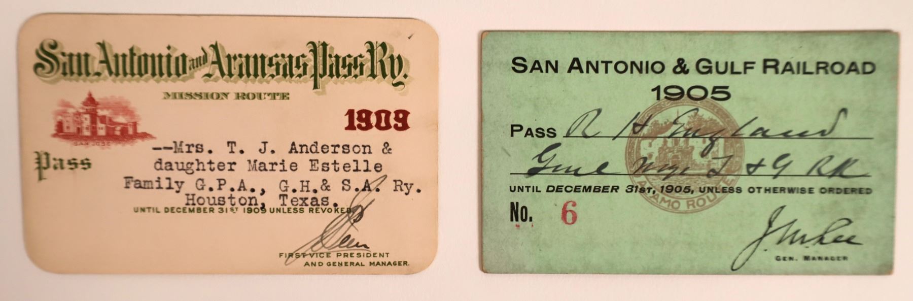 Lot of 2 different. 1) San Antonio & Gulf Railroad. "Alamo Route." Pass issued for 1905 to RH England. Black print with underprint logo on light green cardstock. 2) San Antonio & Aransas Pass Railway. "Mission Route." Pass issued in 1909 to Mrs. TJ Anderson. Signed by the 1st VP. Green print with small vignette of a mission. On cardstock.