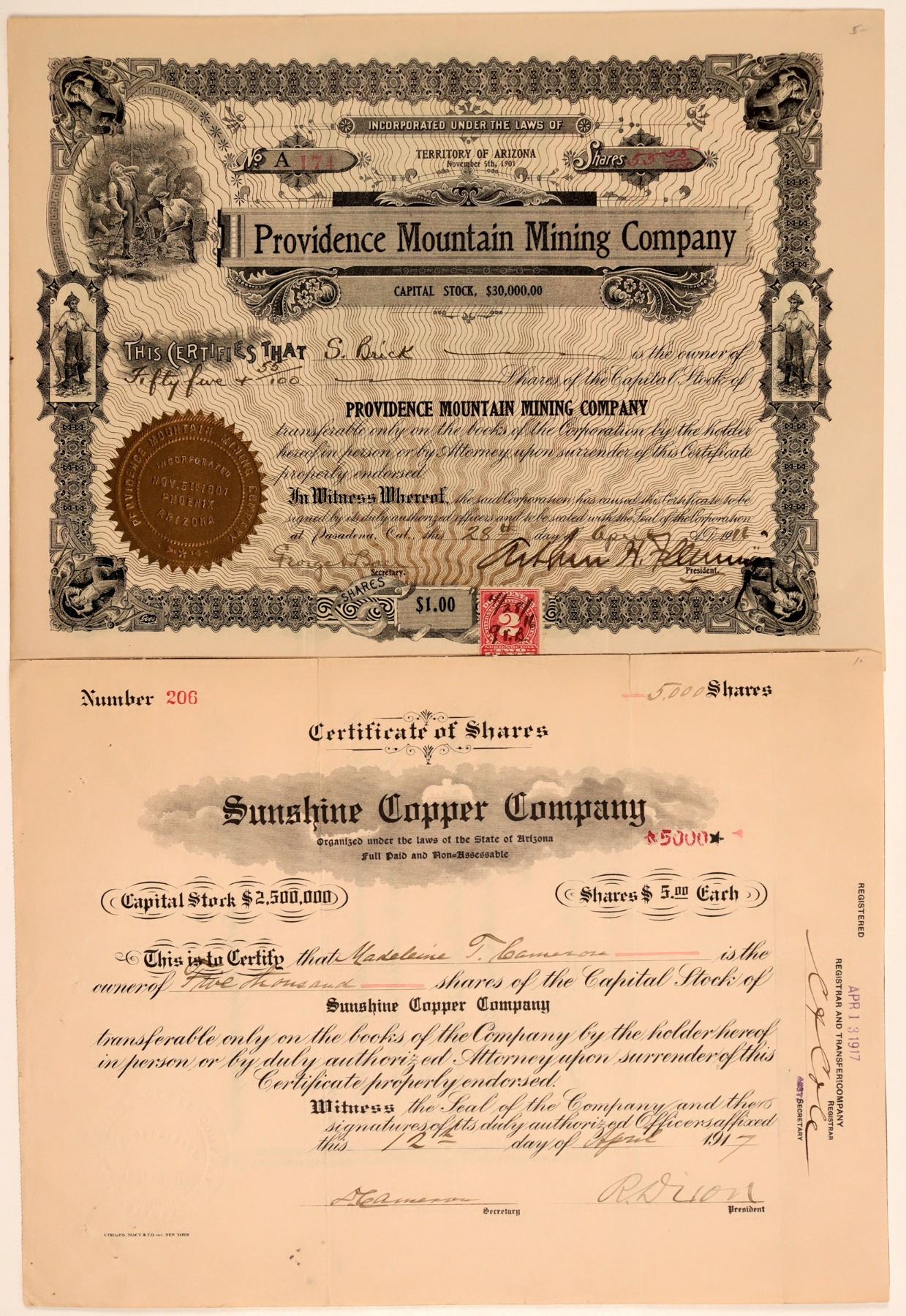Lot of 2 different. 1) Sunshine Copper Company. Stagg. No. 206, issued for 5,000 shares in 1917, not cancelled. Folds, toning, pinholes. 2) Providence Mountain Mining Company. East Mojave. No. A174, issued for 55.55 shares in 1916, not cancelled. Multiple mining vignettes. Folds.