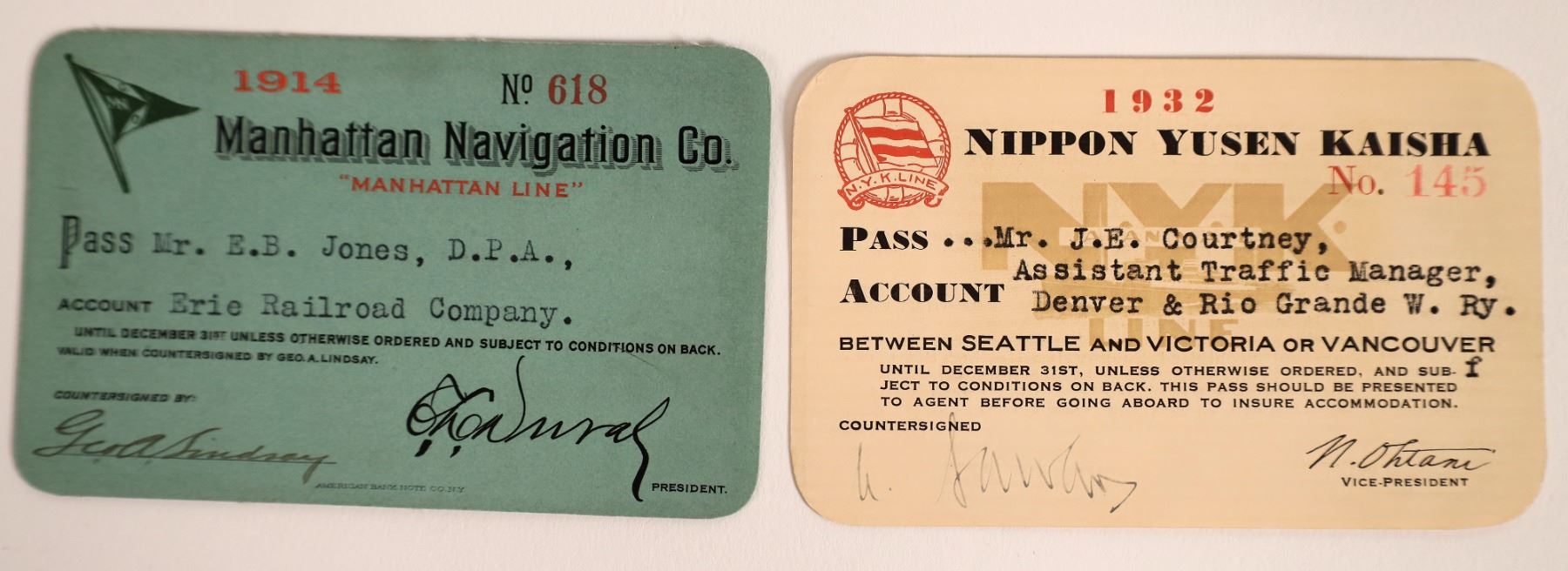 Lot of 2 different. 1) Manhattan Navigation Company. "Manhattan Line." Pass issued for 1914 to EB Jones of Erie Railroad Co. Black and red print with green flag vignette on cardstock. 2) Nippon Yusen Kaisha. Between Seattle and Victoria or Vancouver. Issued for 1932 to JE Courtney of the Denver & Rio Grande. Red logo with underprint vignette. 1914-1932