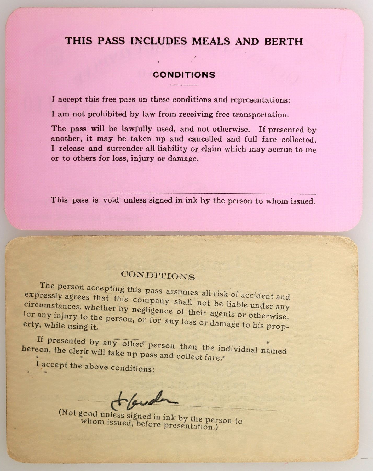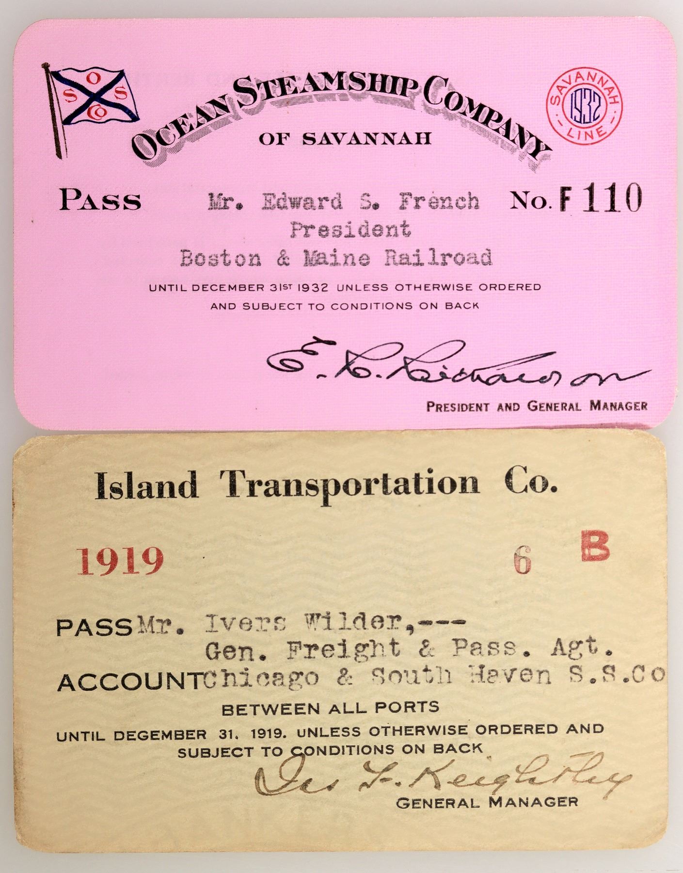 Lot of 2 different. 1) Island Transportation Company. Washington state. Pass issued for 1919 to Ivers Wilder of the Chicago & South Haven Railroad. Signed by the general manager. The Island Transportation Company began running passenger ferries between Mukilteo and south Whidbey Island in 1911, with car ferry service added in 1919. The company sold to Puget Sound Navigation Company (the Black Ball Line) in the 1920s. 2) Ocean Steamship Company of Savannah. Pass issued for 1932 to Edward French, president of the Boston & Maine Railroad. Preprinted signature of the president. Flag vignette on pink paper. 1919-32