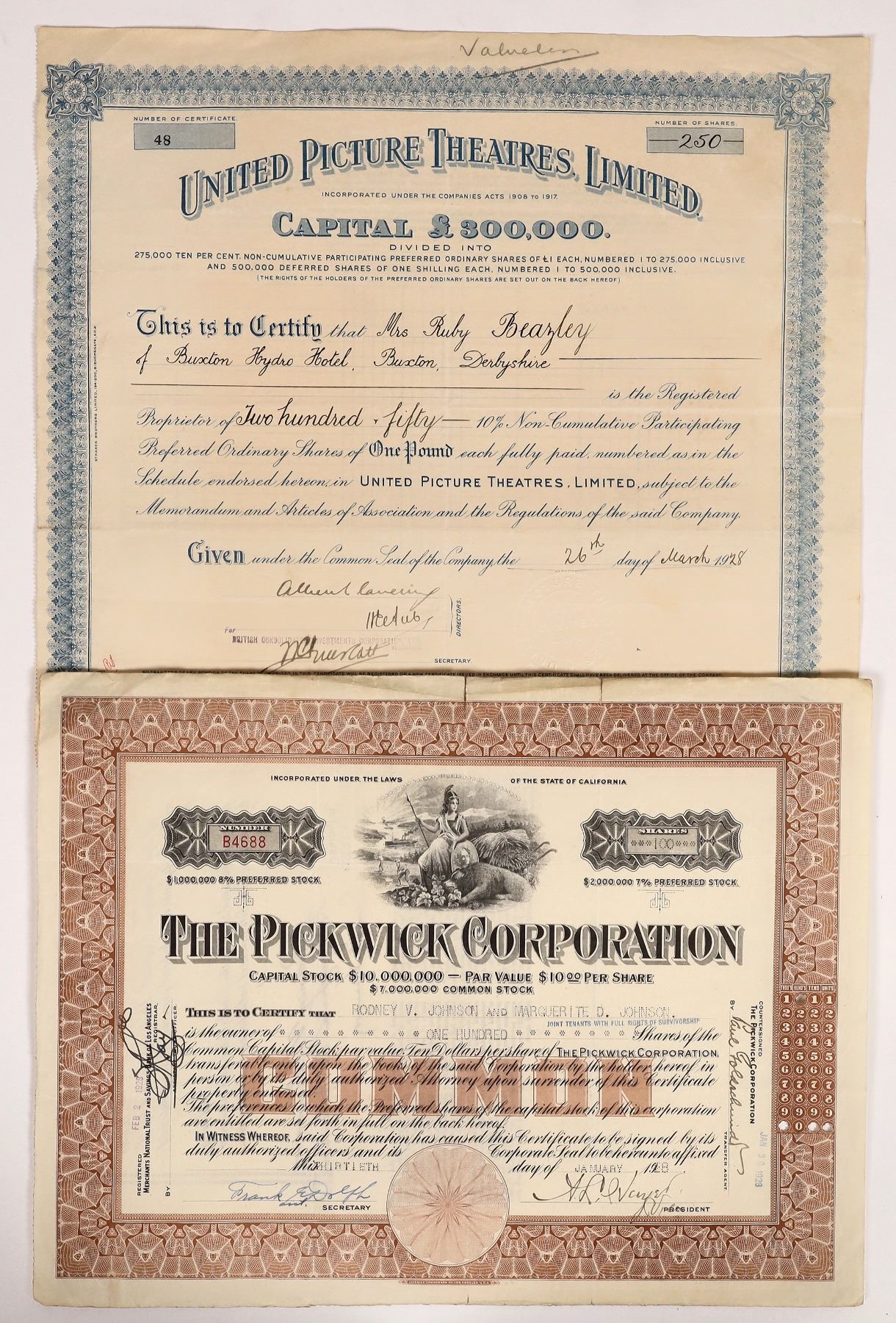 Lot of 2 different. 1) United Picture Theatres, Limited. Issued in 1928 for 500 shares to Ruby Beazley. Signed by two directors and one secretary. Not cancelled. Blue border and print. Folds, creases. 11 x 12" Operated multiple theaters in London. 2) The Pickwick Corporation. Inc. in California. Issued for 10 0shares in 1928. Signed by the vice president and asst. secretary. Not cancelled. Brown border, black print, California-themed allegorical vignette with woman and bear. Folds, creases, some separation along folds. 9.5 x 12" The company was named for its office location, the 1904 San Diego Pickwick Theater, built by Louis J. Wilde, primarily for vaudeville but converted to movies in 1922 and demolished in 1926. Operated Pickwick Broadcasting, Pickwick Hotels, Pickwick Stage Lines, and more.