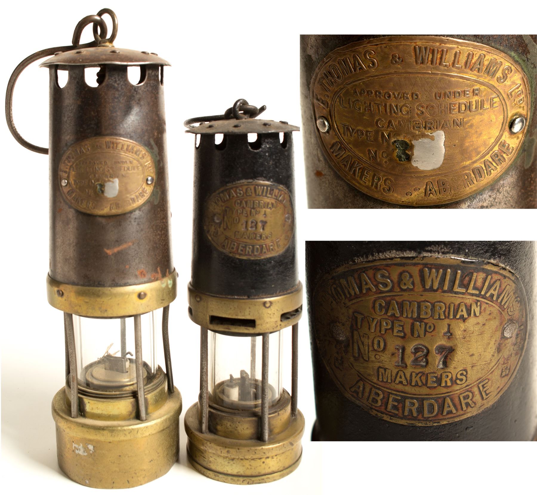 Two different sizes of the Thomas and Williams safety lamps. Both have the large oval brass plaque from Thomas and Williams of Aberdare. The two lamps are slightly different, The smaller of the two has vents in the brass above the glass and the larger lamp does not have that venting. The small lamp is 10 inches tall, 3 1/4 inch diameter, and the tall lamp is 12 inches tall and 4 inches in diameter. Nice pair. State: City: HWAC#: 47134 Date: