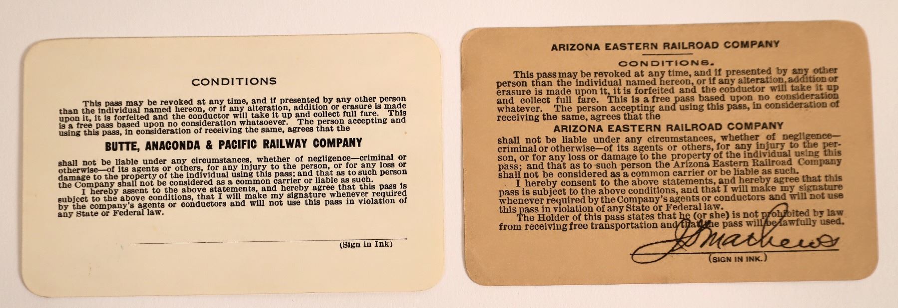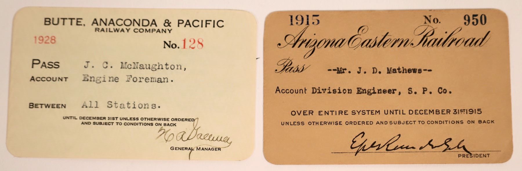 Lot of 2 different. 1) Arizona Eastern Railroad. Pass no. 950, issued for 1915 to JD Mathews, Southern Pacific Company. Signed by the president. Black print on light brown paper. Founded in 1895, ran between Clifton, Arizona, and Miami, Arizona. 2) Butte, Anaconda & Pacific Railway Company. Pass no. 128, issued for 1928 to JC McNaughton, engine foreman. Signed by the general manager. Black print on white paper.
