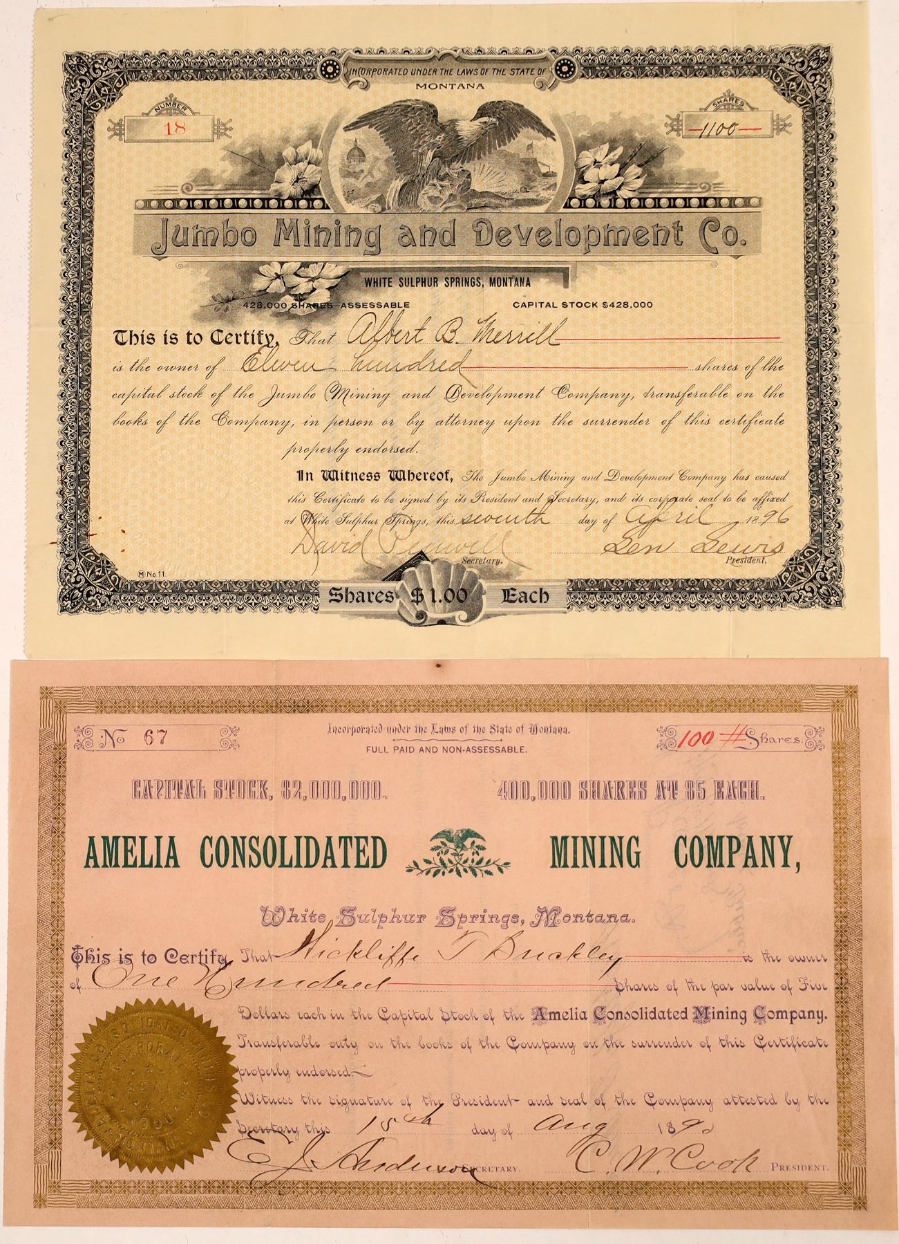 Lot of 2 different, both self-identified. White Sulphur Springs is near Yellowstone. 1) Amelia Consolidated Mining Company. No. 67, issued for 10 0shares in 1890 to Hickliffe T. Buckley. Signed by president CW Cook and secretary E. Anderson. Not cancelled. Gold border and seal, green and purple print. Folds. 2) Jumbo Mining & Development Company. No. 18, issued for 1,100 shares to Albert Merrill in 1896. Signed by president Seurs and secretary David Powell. Not cancelled. Black border and print. Eagle and floral vignettes. Folds, paperclip stain.