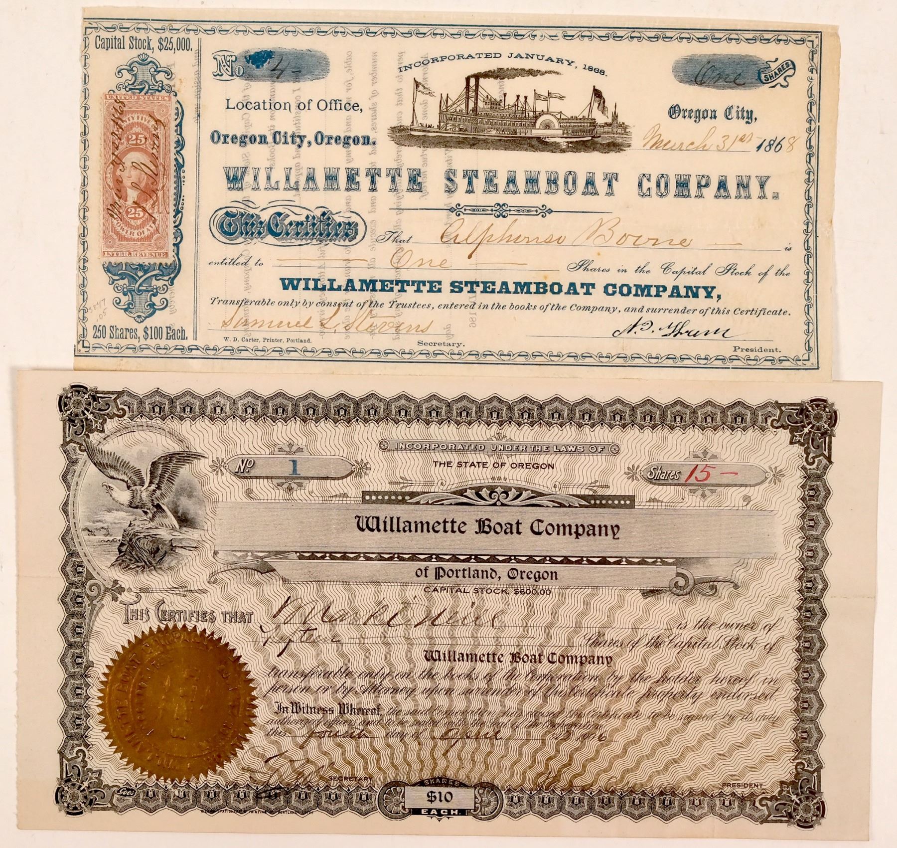 Lot of 2 different. 1) Willamette Steamboat Company. Location of Office, Oregon City. Inc. in 1868. Low number 4, issued for one share to Alphonso Boone on March 31st, 1868 in Oregon City. Signed by the president and secretary Stevens. Not cancelled. Blue border and print, paddle steamer vignette. Printed by WD Carter, Portland. 25 cent adhesive revenue stamp attached on the left. Folds, some wear to edges. 4.25 x 8.75" Rare! 2) Willamette Boat Company. Stock number ONE, issued for 15 shares in 1906. Not cancelled. Black border and print, gold seal, and eagle vignette. Folds, toning.