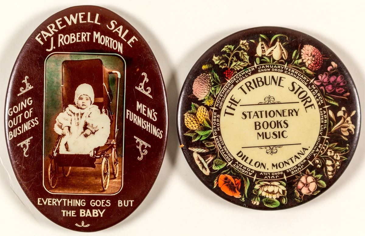 1) Unlisted. Oval, 2.75" x 2" ad mirror. Farewell Sale / J. Robert Morton / Going Out of Business / Men's Furnishings / Everything Goes but the Baby. Toned photo of baby in carriage. Good condition. 2) Unlisted. Round, 2.25". The Tribune Store / Stationary Books Music / Dillin, Montana. Ad is in center, surrounded by color pictures of flowers and months they are for. Good condition. (Svoboda Collection) City: Dillon State: Montana Date: HWAC# 33836