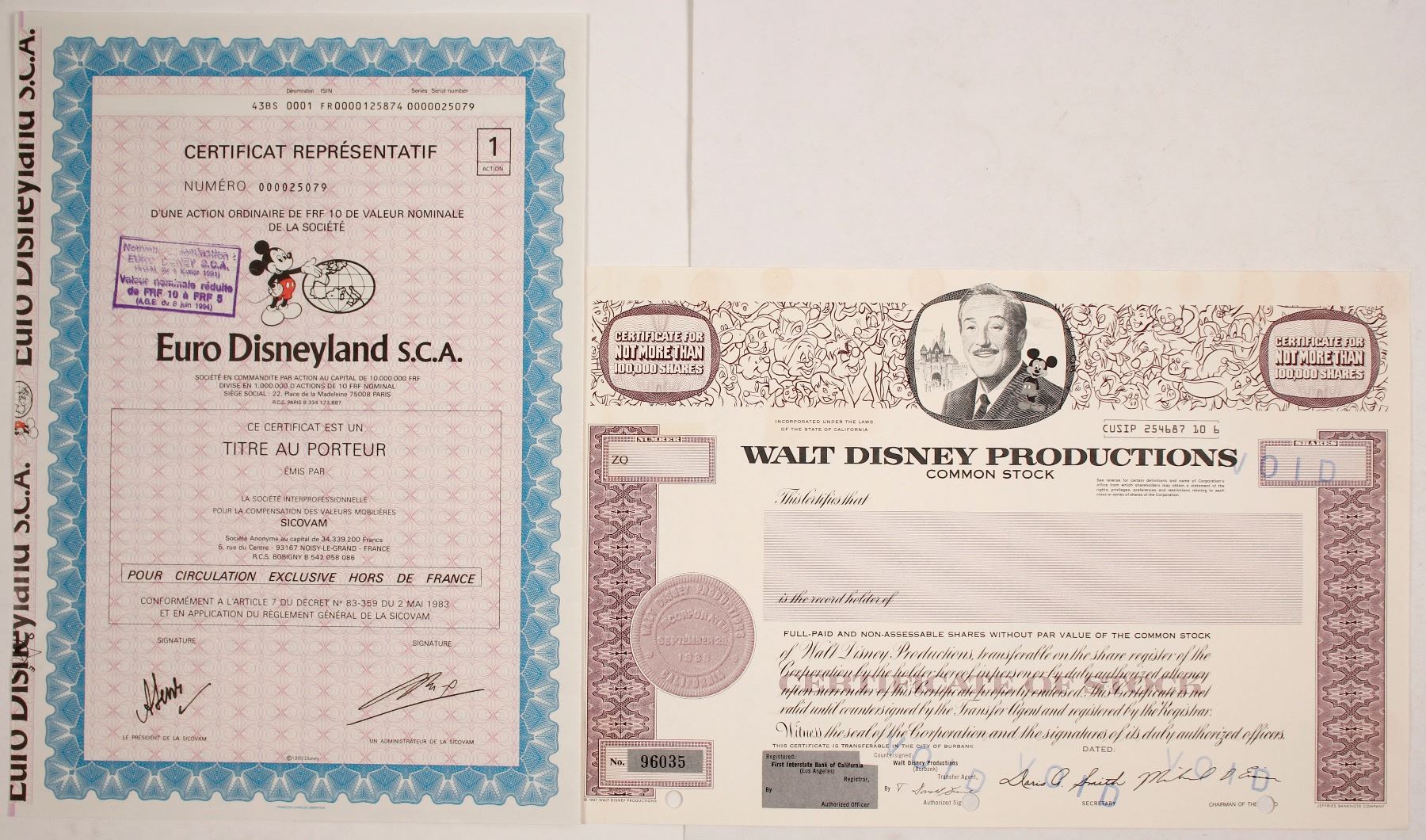 Lot of 2 different. 1) Unissued but cancelled Walt Disney Productions Common Stock featuring a photo vignette of Walt Disney and Mickey Mouse and illustrated Disney characters in the background. Machine printed signature of Michael Eisner as chairman. Punch cancelled. Glue residue on the reverse. 2) 1983 French certificate for Euro Disneyland SCA with vignette of Mickey Mouse. 14 coupons still attached. Date: City: Los Angeles State: California HWAC# 77555