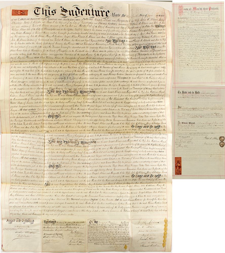 Lot of two deeds, each with an R89 adhesive revenue stamp. 1) A deed from June 1866 with an imperforated R89. Deed is for transfer of property to Boston and Worchester Railroad Company. Very good condition. 2) Large (30" x 25") deed from Boston, 1864 with R89. Printed on heavy paper.