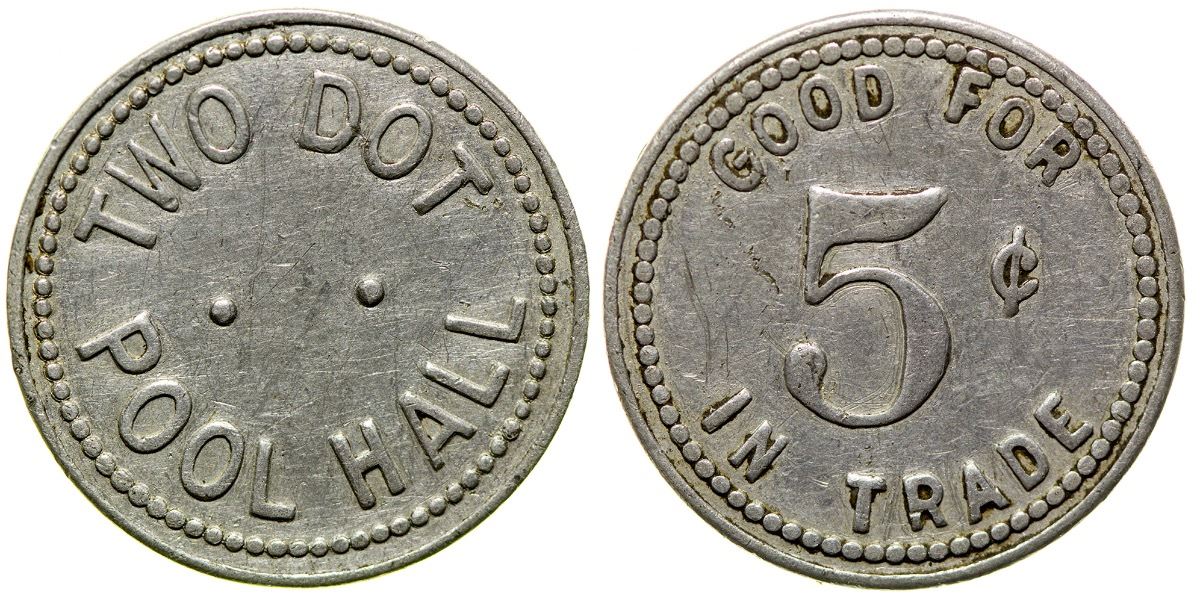 R-8. Two Dot / Pool Hall // GF / 5c / IT. Round, aluminum, 20mm. (Svoboda Collection) City: Two Dot State: Montana Date: HWAC# 35077