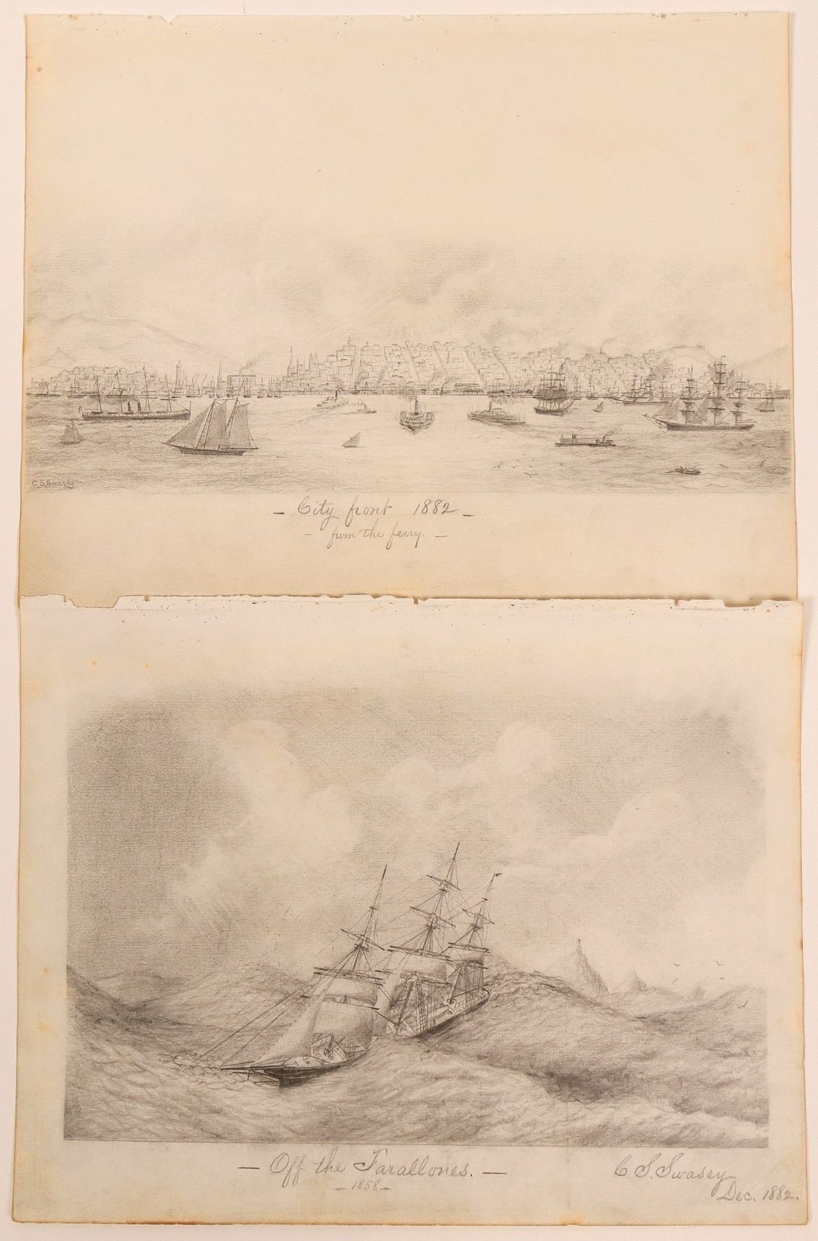 Nice pencil drawings of the Bay area by Charles S. Swasey (1827-1909). Drawings: "Off the Farallones" signed C.S.Swasey, Dec. 1882. 7.5" x 9.5", on paper. "City Front--from the Ferry 1882", signed C. S. Swasey. 7.5" x 9.5" on paper. Swasey was born in Thomaston, ME. Swasey sailed around the Horn to California in 1850. After mining in the Mother Lode area for several months, he established a hotel in Sacramento. Subsequently, he moved to San Francisco where he was an official at the mint and cashier at the Custom House. Primarily a marine painter, Swasey also painted murals in homes and other public places. We do not know the relation of Swasey, but assume he was a friend of the Nahls. His drawings are from the Nahl archive.