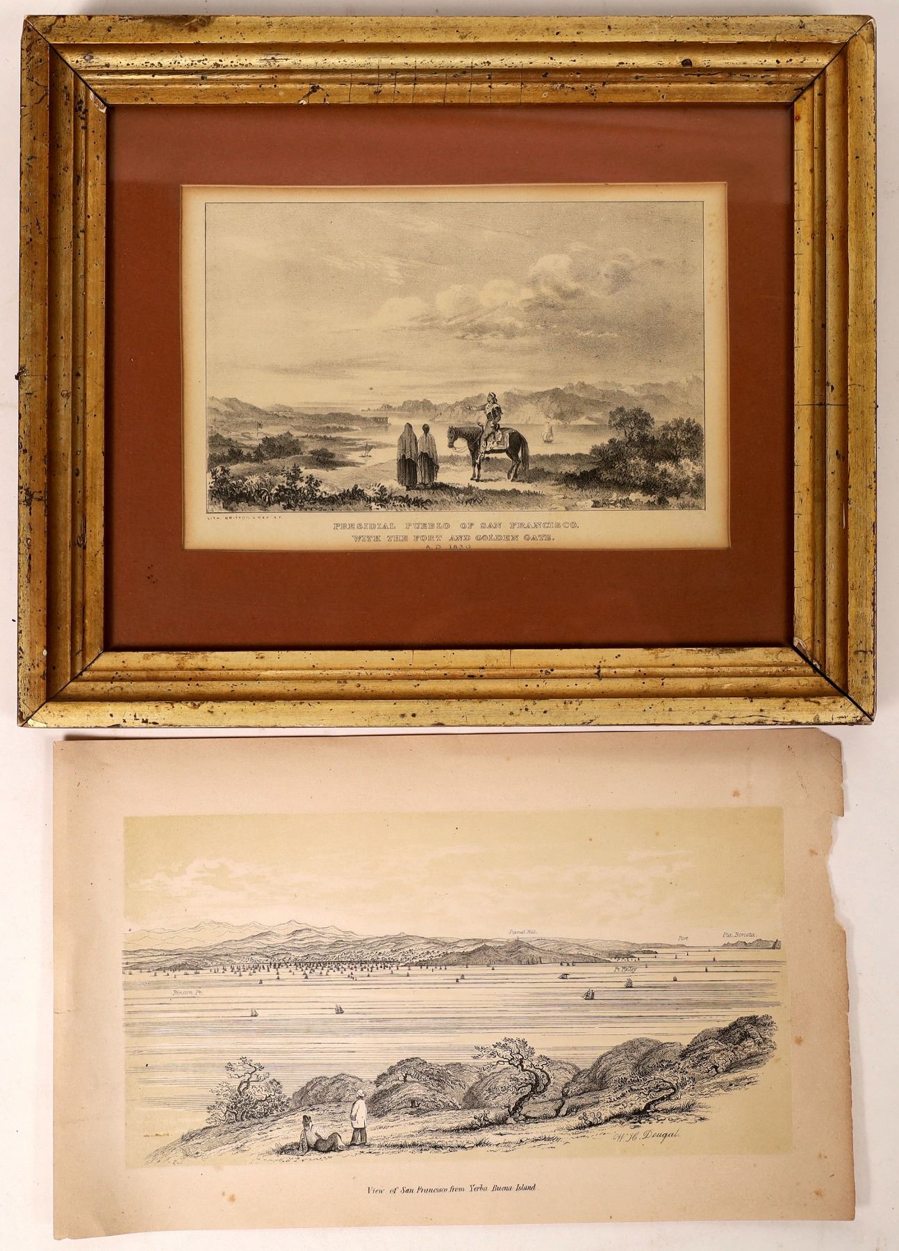 Two lithographs depicting the San Francisco Presidio and the Golden Gate. Renderings measure 11"x 7". One is framed, the other, loose.