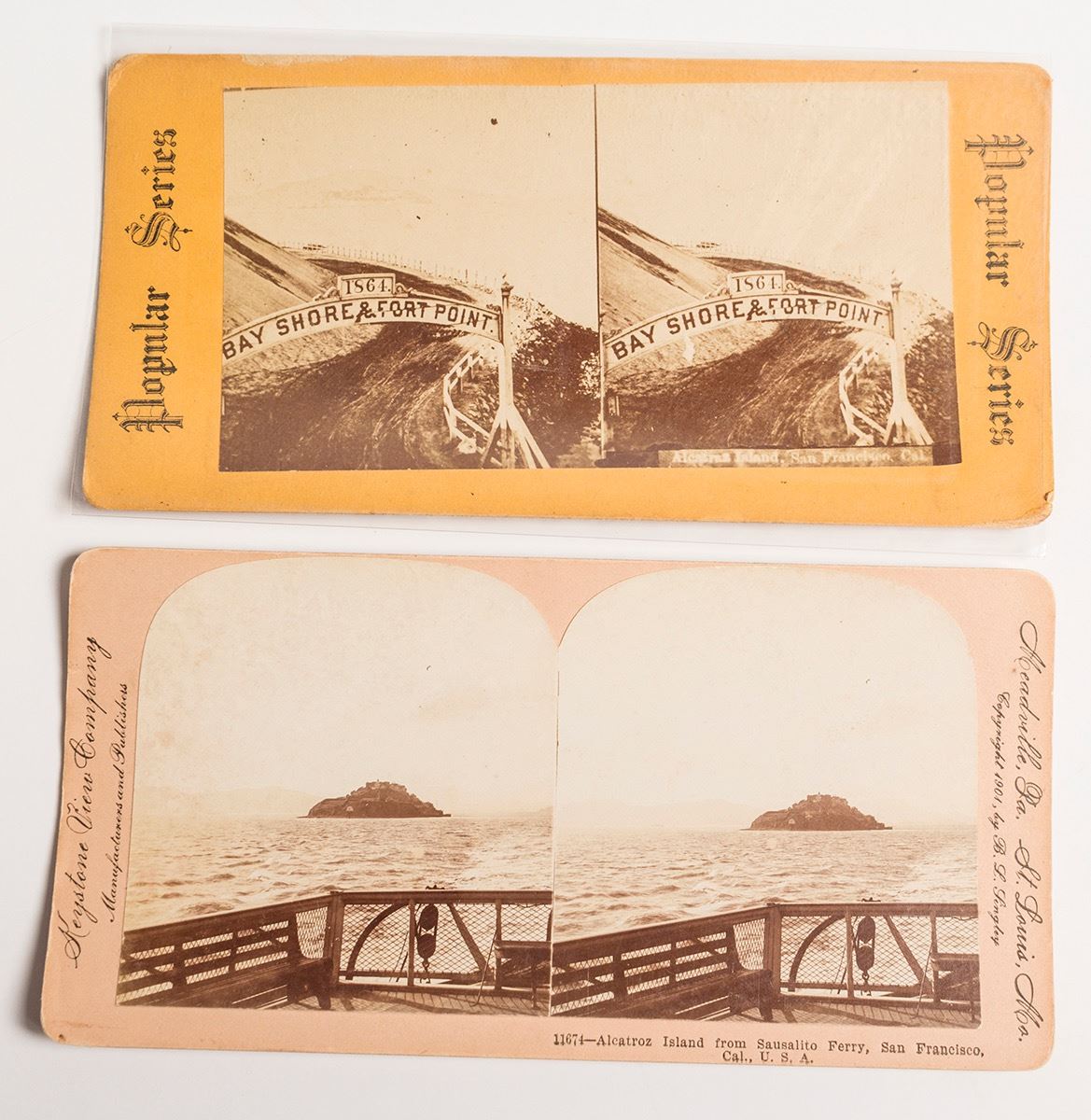 1) c.1901 view from Sausalito Ferry by Keystone View Co. Nice contrast and detail. 2) c.1864 view from Bay Shore & Fort Point. Contrast very weak. Popular Series, no publisher listed. Alcatraz Island first was used as a military fortress in the late 1850s. It became the infamous unescapable prison starting in 1934. (Prag Collection) Date: Location: San Francisco, California HWAC# 54716