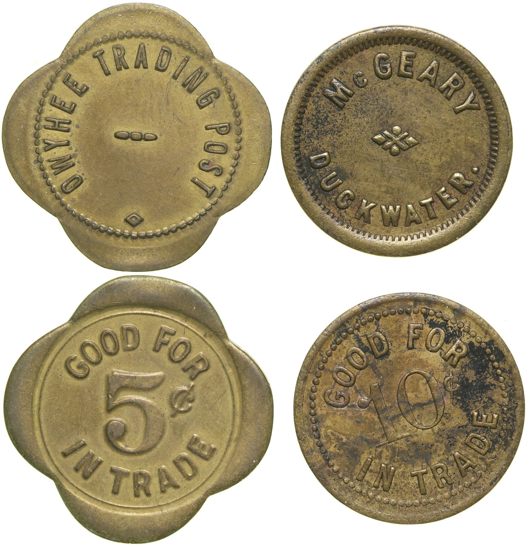 Lot of two: 1) M. Geary / Duckwater // Good For / 5c / In Trade; Br. rd., 21 mm. 2) Owyhee Trading Post // Good For / 5c / In Trade. Br., scalloped, 23 mm. Salvatore Falcone Collection.
