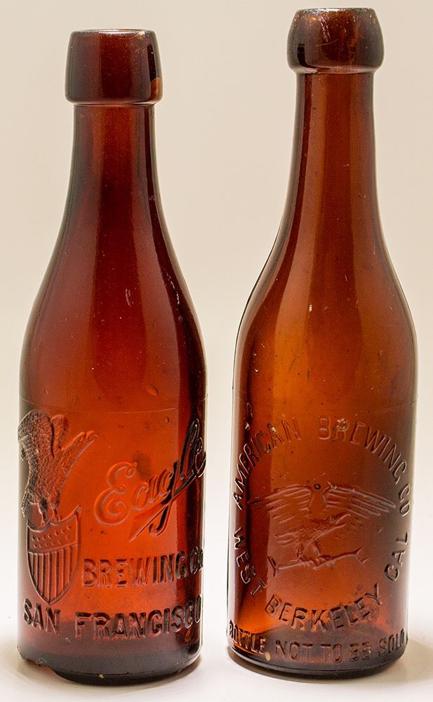 Two beer bottles with embossed Eagles from California. American Brewing Company, West Berkeley Cal, with picture of an eagle on a branch. This beer bottle is also a split like many of the others in this collection. Inside lip bruise no glass missing and a tiny bit of surface wear. The second bottle is Eagle Brewing Company, San Francisco, another Amber split. This bottle has a 1" base chip. City: State: California Date: Inventory# 40947