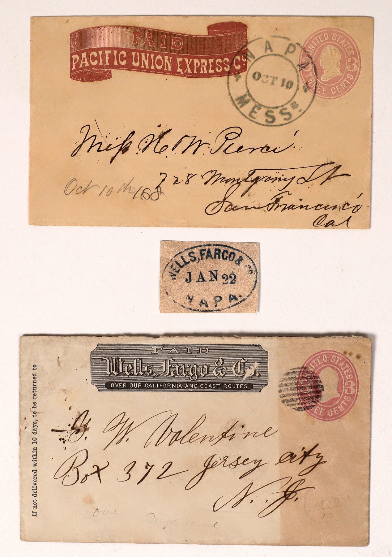 1) Strong Napa Mess(enger) postmark on Paid Pacific Union Express. Sent to San Francisco. Handwritten Oct, 10th 1868. Extremely nice piece! 2) Paid Well Fargo 3c entire. Sc U58. Reverse has a Jan 22, Napa Wells Fargo postmark. Sent to Jersey City. Three cents would have been unusual for cross country mails???