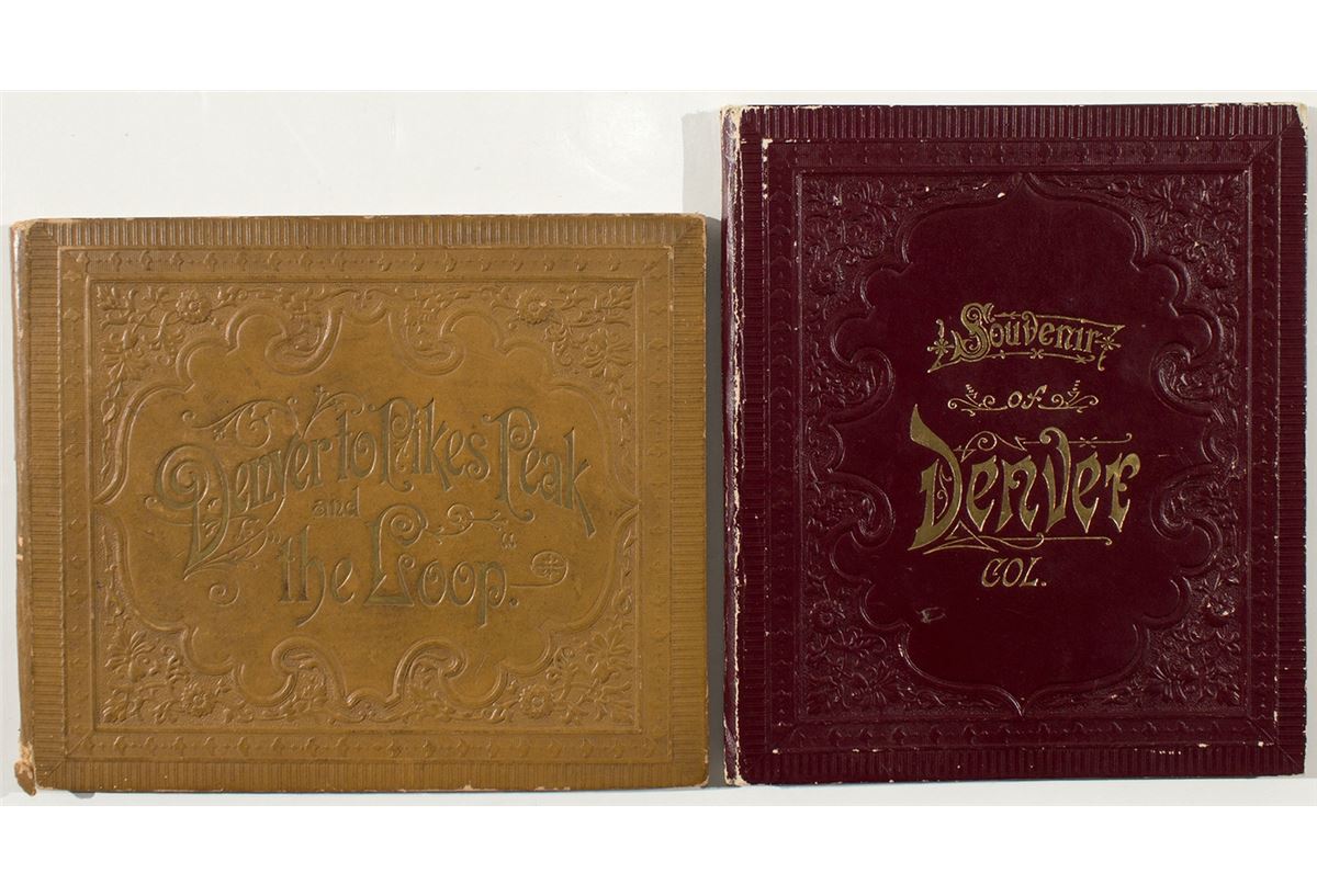 1) Denver to Pikes Peak and the Loop. Tan embossed hard cover (blind emboss design, front and back) with faded gold type. (5" x 6") 15 pp. of duo-tone engravings. Used condition. 2) Souvenir of Denver, Colorado. Maroon cover, embossed design front and back, gold type. (6" x 5") 12 pp. Duo-tone engravings of Denver city buildings. Used condition.