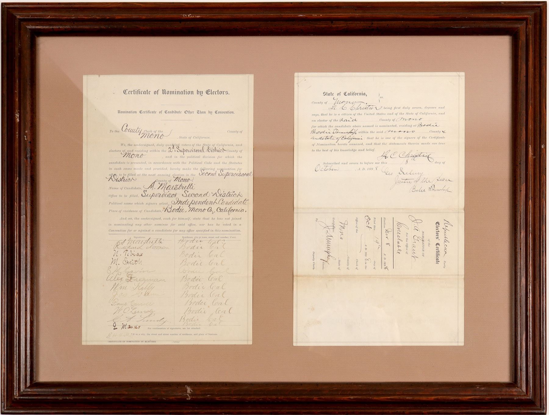 Certificate of nomination by electors, Bodie, Mono County, CA. Nomination of JA Grant for office of counselor. Framed and matted, 21x26.5"