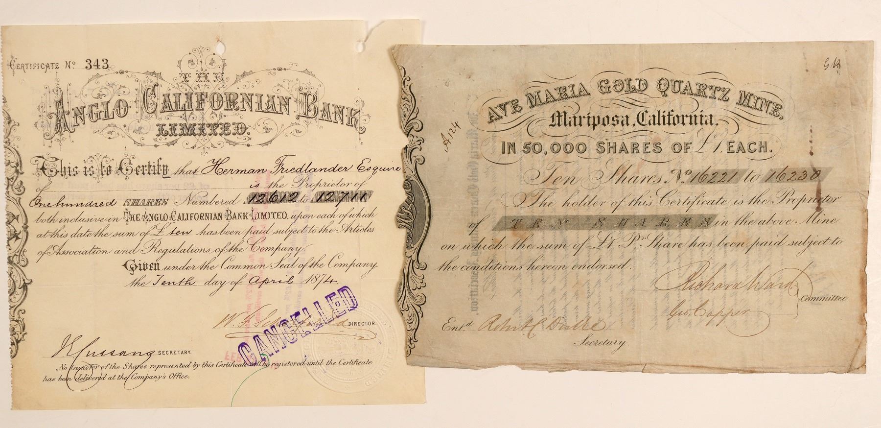 1) Ave Maria Gold Quartz Mine. N;s 16221 to 16230. 1851. 2) Anglo Californian Bank Limited. # 343. 1872. Cancelled. Both have edge issues. According to the company's description detailed on the reverse of each stock, this London based association held half the rights to the Ave Maria Gold Quartz Mine in the Mariposa District, California which would be worked under a lease with the owner of the other half. The Ave Maria's place is verified by a letter written from John Duncan to John Fremont on December 26, 1851. In the letter he clearly states that the Ave Maria is located on the Mariposa Estate and on the Ave Maria River. [Ref: The Expeditions of John Charles Fremont, Volume 3, edited by Spence]. Today the Ave Maria River is known as the Stockton Creek [Ref: Gudde]. There was a small town by that name at the confluence of the Ave Maria and Mariposa. State: California City: Mariposa Date: 1851, 1872