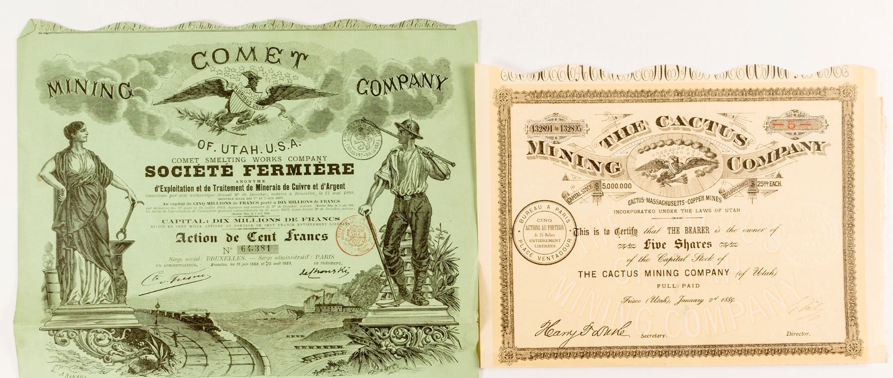2 French Utah silver mine bond certificates. Green Comet Smelting Works #64381 16.25" x 12.5". Brown Cactus Mining Co. #13291-13295 5 shares 15.5" x 11". Date: Location: French, Utah HWAC # 54347