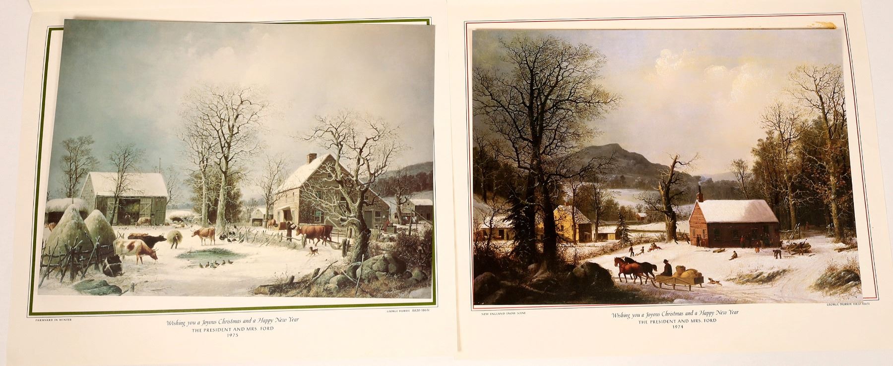 Copied lithos of two country landscape scenes painted by American artist George Durrie (1820-1863). One is titled "Farmyard in Winter" the other, "New England Snow Scene." each measure (18"x 15") and come in folders embossed with the Presidential Seal.