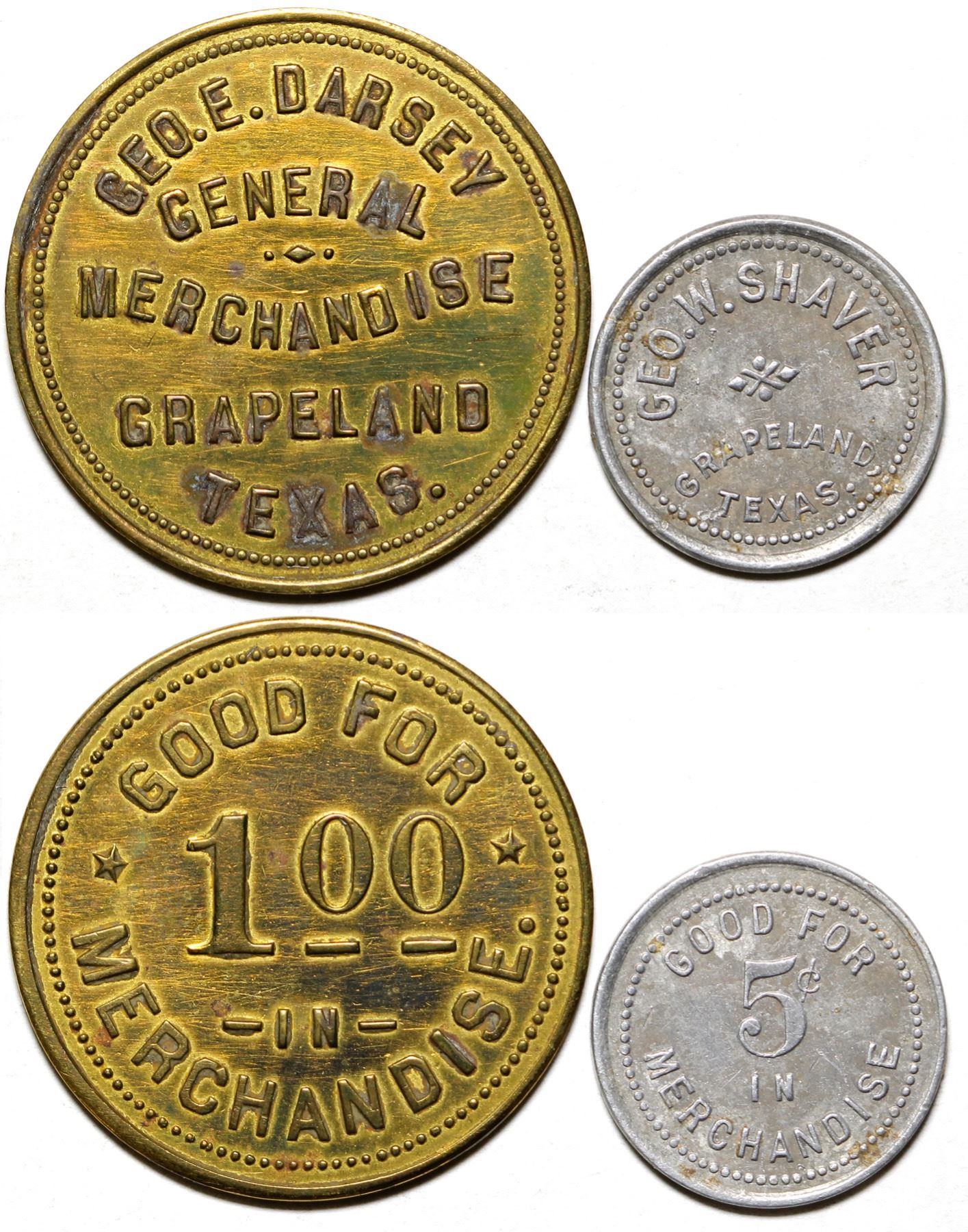 Two tokens. Geo. E. Darsey ( GF $1.00 IM) and Geo. W. Shaver (GF 5c IM). State: Texas City: Grapeland Date: HWAC# 85317