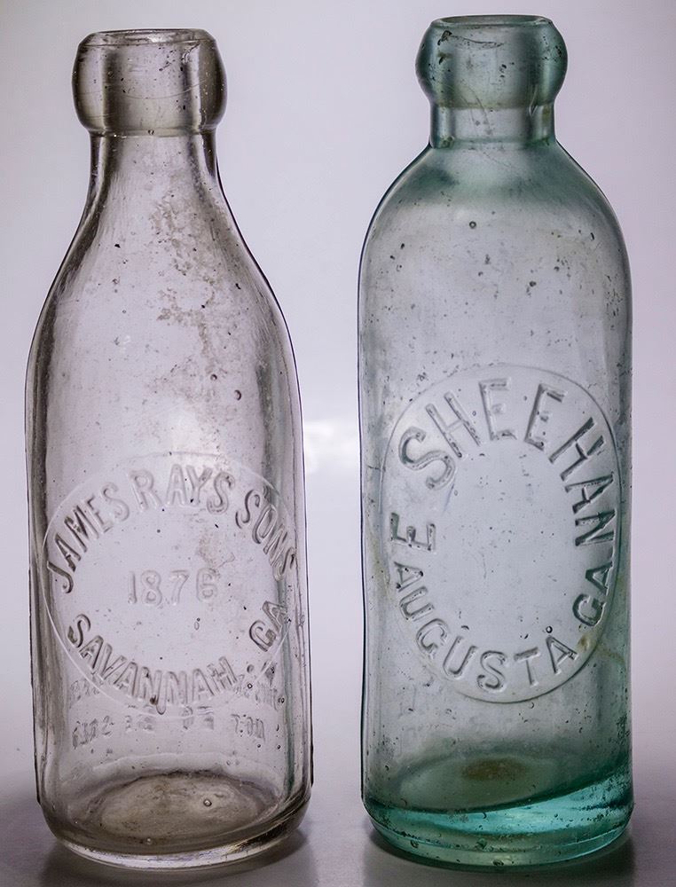 Two Georgia soda bottles. Sheehan, Augusta Georgia aqua touch, very light haze. James Ray's Sons 1876 Savannah Georgia clear tool top blob soda. Both without visible chips or cracks. HWAC# 571514 Date: Location: Georgia